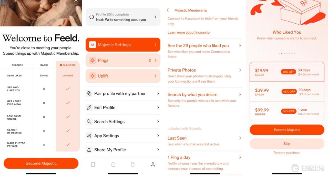 目前Feeld的订阅价格是每月 19.99 美元、每季度 39.99 美元、每年 99.99 美元,订阅价格高于Tinder 等常规约会交友平台、与同志交友应用Grindr持平。
