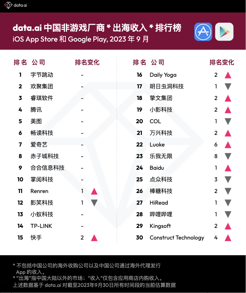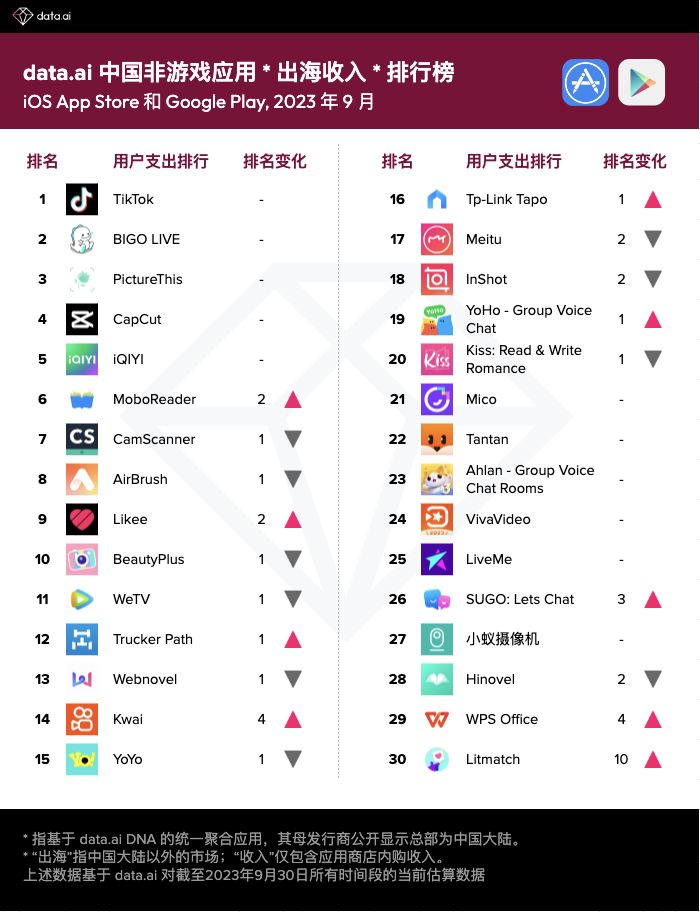 原标题:【出海榜单】2023 年 9 月中国非游戏厂商及应用出海收入 30 强