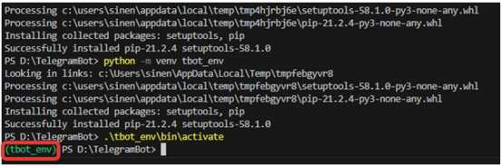 其中tbot是环境的任意一个名称。在成功创建新环境之后,项目目录中将出现一个带有环境名称的文件夹。在这个例子中,它是bot_env。现在需要通过运行激活脚本来激活它:
