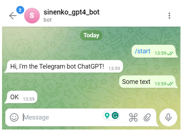 现在打开Telegram,并使用FatherBot给的链接与bot进行聊天。在这个例子中,它是:t.me/sinenko_gpt4_bot