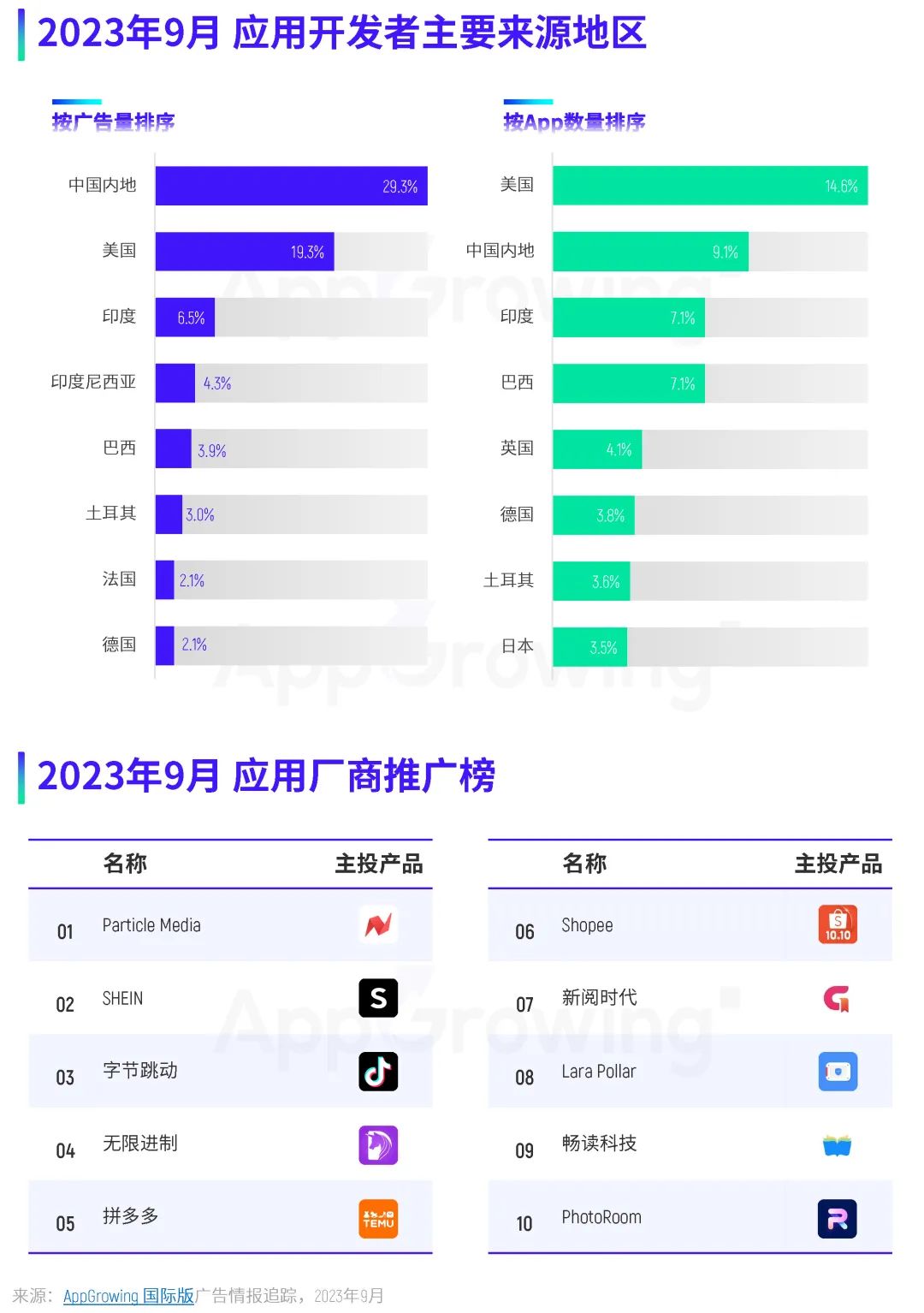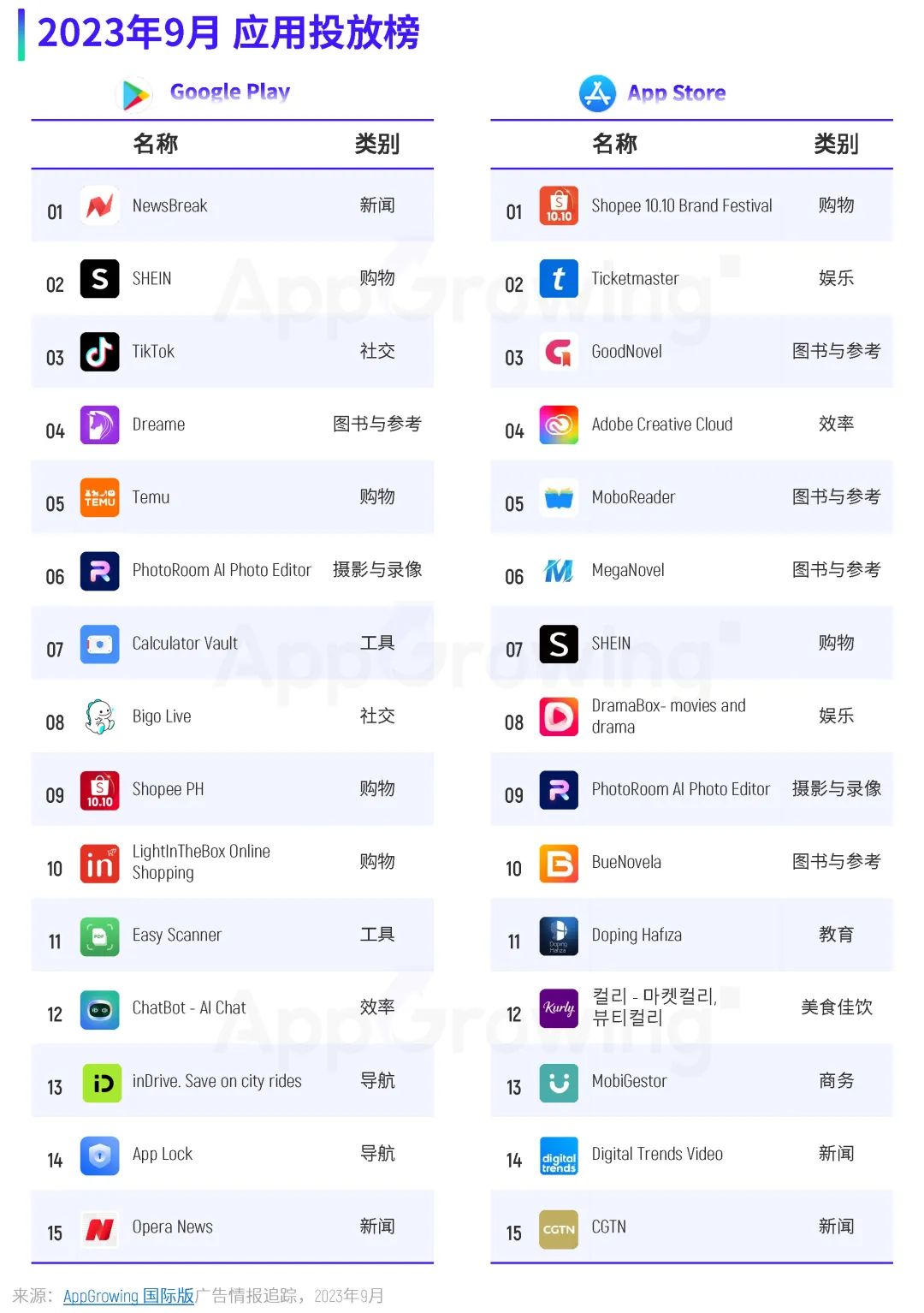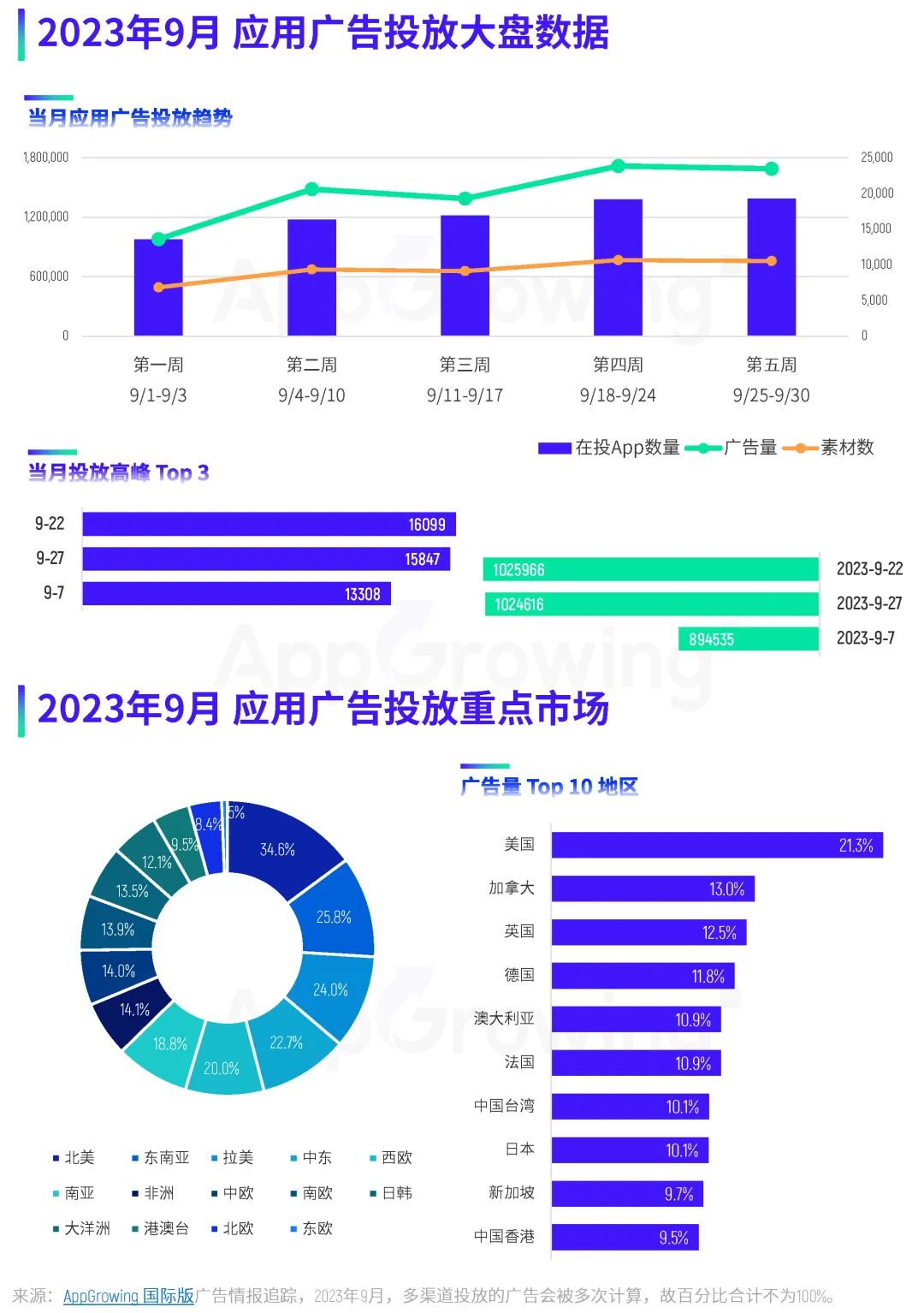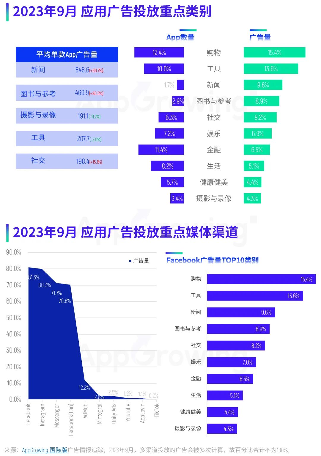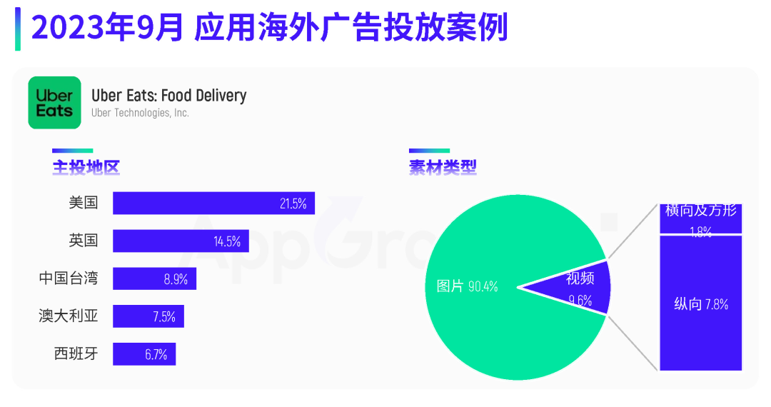 以下是 AppGrowing 出海观察根据全球 50 个国家/地区、25 家全球性媒体平台的广告数据,对 2023 年 9 月应用海外买量特征进行的分析。 应用广告投放趋势 当月广告投放量与在投 App 数量高峰主要集中在下旬,第四周与第五周的广告量接近 180w+,在投 App 数量均超过 1.5w 款;素材数则保持平稳增长趋势,除了第一周,其余单周素材投放量均超过 60w 组。 单日最高广告量和在投 App 数量出现在 9 月 22 日,广告量超过 102 万,在投 App 数量为 16099,相较 8 月份数据有着明显增长。 按照市场区域来看,9 月份广告量投放地区前三为北美地区、东南亚地区和拉美地区,分别占比 34.6%、25.8% 和 24%。另外,广告量占比超过 20% 的地区还有中东和西欧。 广告量 TOP10 地区榜单上,美国依旧位列榜单第一,广告量占比为 21.3%,相较 8 月份下降了 18.2 个百分点;随后是加拿大和英国,占比分别是 13% 和 12.5%。相比 8 月份,应用开发者在 9 月将更多广告投向了欧美、日韩等 T1 市场。 在投放重点类别方面,购物类取代工具类成为 9 月投放广告量占比最高的类别,占比为 15.4%;其次是工具类和新闻类,广告量占比分别是 13.6% 和 9.6%。在投 App 数量占比最高的依旧是购物类应用,占比达 12.4%;其次则是金融类、工具类,两者的 App 数量占比也超过 10%。 平均单款 App 广告量排名方面,新闻类应用依旧排名第一,环比暴涨 69.7%,其次则为图书与参考、摄影与录像、工具以及社交类,与 8 月份排名一致。 再来看媒体渠道投放情况。据 AppGrowing 国际版 监测,Facebook、Instagram、Messenger、Meta Audience Network 是应用广告投放的 TOP4 媒体,其广告量占比均超过 70%,其中 Facebook 渠道的广告量占比达 81.3%。具体看 Facebook 渠道的各类别投放情况,购物、工具、新闻、图书与参考类为投放主力。 应用开发者主要来源地区分布上,9 月份广告量占比最大的依旧是中国内地,在投 App 数量占比 TOP1 则是美国;值得关注的是,印度开发者的广告投放量和在投 App 数量占比均排在第三位,增长明显。 9 月应用厂商推广榜中,前三分别是 Paticle Media、SHEIN 以及字节跳动。进入 TOP10 的中国内地厂商还有无限进制、拼多多、新阅时代、畅读科技,共有 6 位中国厂商打入投放前十。 热投应用 & 推广榜单 9 月应用推广榜中,Google Play 端上榜最多的仍为购物类应用,共有 4 款。新闻类应用《NewsBreak》稳居榜单第一,《SHEIN》回归榜单第二的位置,另外还有两款导航类应用打入投放 TOP15。 App Store 端,上榜最多的依旧是图书与参考类,共有4款,相较 8 月份榜单掌控力有所减弱,其中新阅时代的《GoodNovel》跃居榜单第三。此外,上榜产品较多的类别还有新闻、购物、娱乐类。 本期重点应用类别推广榜,AppGrowing 国际版 选取了购物、新闻、工具、摄影与录像这四大类别。 购物类榜单中,《SHEIN》双端都打入投放 TOP8,是买量投入最大的购物类应用,《TEMU》紧随其后。新闻类榜单 TOP1 毫无疑问是《NewsBreak》,《Digital Trends Video》双端均进入投放量前五。 工具类榜单中,《Calculator Vault》拿下第一;摄影与录像榜单中,《PhotoRoom AI Photo Editor》双端打入前三,《TikTok Lite》排在榜单第 8 位,字节跳动对轻量版/小包体应用的推广力度较大。 热投应用素材 & 文案盘点 案例一:《Uber Eats: Food Delivery》 《Uber Eats: Food Delivery》是 Uber 推出的一款外卖类平台,这款应用 9 月主投地区为美国、英国、中国台湾、澳大利亚以及西班牙,素材类型则以图片为主,占比超过 90%。 素材创意方面,《Uber Eats: Food Delivery》主要目的为突出平台优势,并使用了真人演绎、卡通动画等形式做包装,呈现较为丰富。 比如这组素材,以卡通动画形式,通过App吉祥物的演绎,展现餐品配送快速、安全的情景,可爱的卡通形象增添趣味性,同时加深用户对品牌的印象。 来源:AppGrowing 国际版 在投放的视频素材中,真人素材占据较大比重,且多通过情景剧形式表达内容。比如这组真人素材,视频中儿子向母亲提议点外卖,并打开 App 向其展示店铺和餐品的丰富程度,两人对话传递 App 功能和优势,更具现实生活气息。