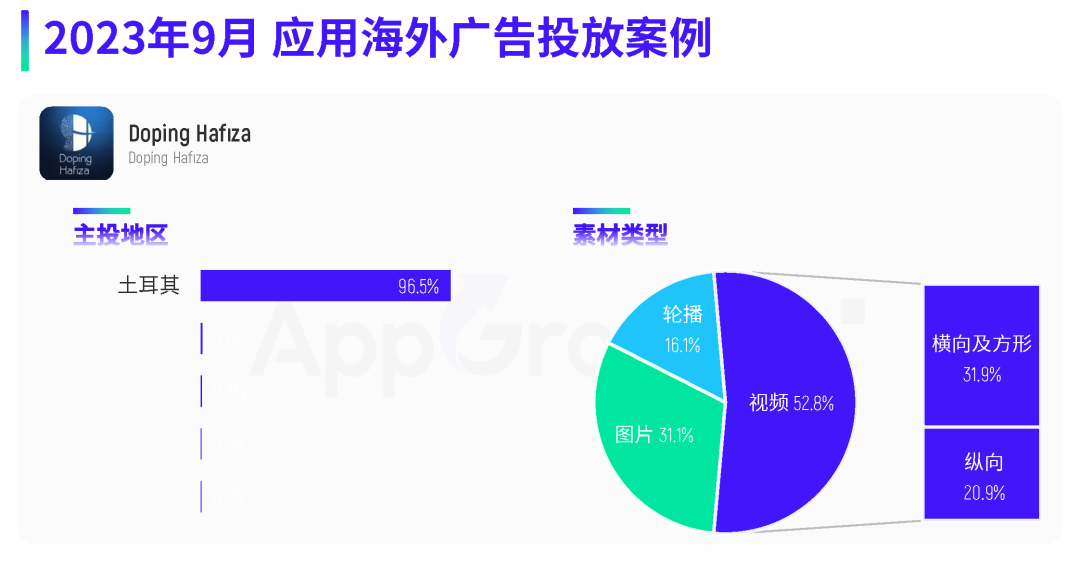 来源:AppGrowing 国际版 案例二:《Doping Hafıza》 《Doping Hafıza》是一款专注土耳其市场的教育类应用,9 月份在土耳其市场的投放量占整体投放的 96% 以上;投放的素材类型除了图片和视频,还投放了较多轮播类型的素材,占比达到 16.1%。 素材创意方面,《Doping Hafıza》同样通过真人演绎、UE 动画等形式传递平台价值。比如这组素材,以 MG 动画形式介绍 App 核心功能和优势,简洁有趣,同时给用户带来专业权威的印象。 来源:AppGrowing 国际版 真人素材中,除了常见的真人口播、情景剧形式,《Doping Hafıza》做了一些其他尝试丰富内容维度。比如这组素材,通过真实场景实拍的方式,展示用户使用 App 帮助自己学习的情景,第一视角的拍摄角度增强代入感,并在画面上方以文字补充说明产品功能和卖点。 来源:AppGrowing 国际版 以上为《9月应用月报:应用热投趋势解读,购物类应用广告量排名第一》。