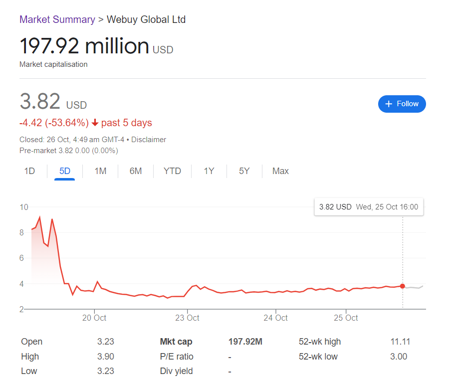 低调上市近一周后,WEBUY GLOBAL 股价比上市当天最高股价相比跌幅超 50%,但基本与发行价保持一致。截止发稿时间,WEBUY GLOBAL 每股股价约为 3.82 美元,市值约 2 亿美元。