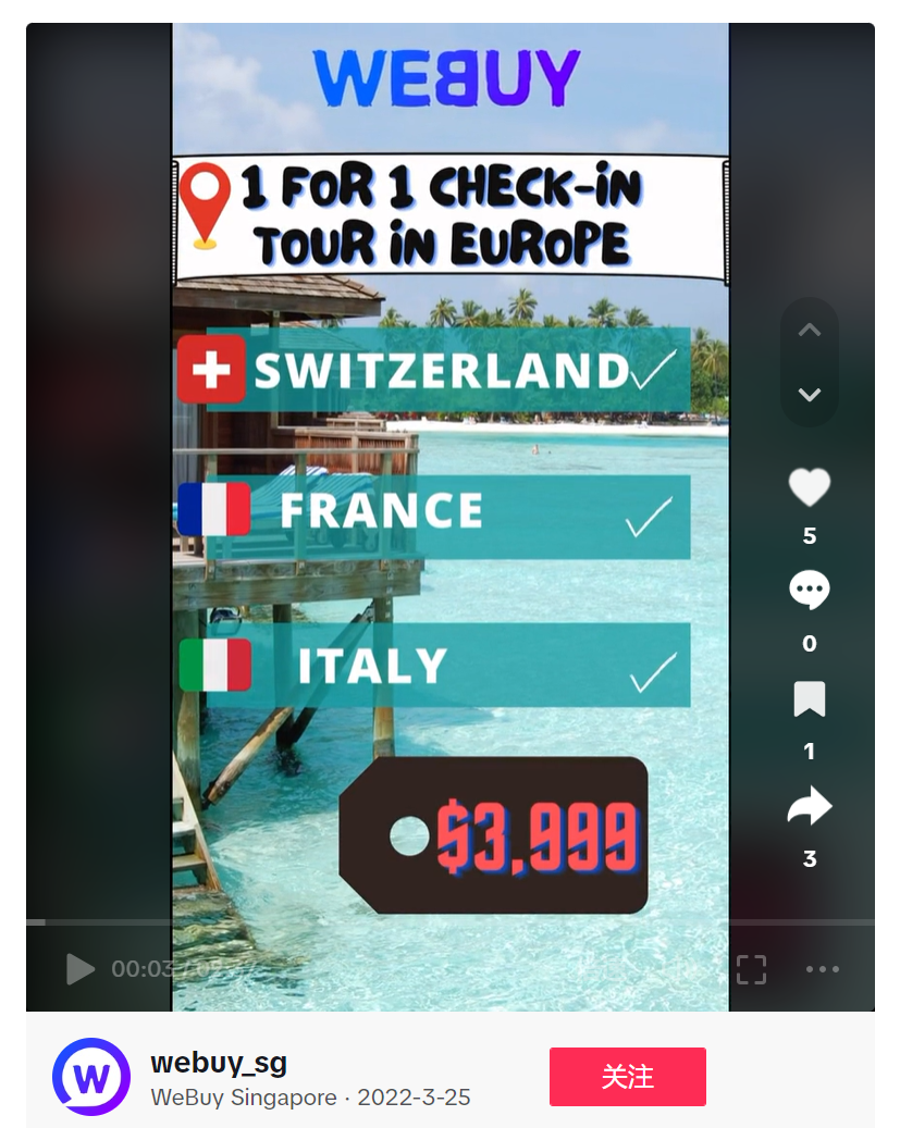 值得注意的是,WEBUY 在招股书中还提到从 2022 年开始增加的跟团旅游业务。而跟团游的性价比符合东南亚国家的消费习惯,极有可能在后疫情时代为 WEBUY 带来了新的增长点。7 点 5 度发现了 WEBUY 在 TikTok 的官方账号,据其短视频广告,WEBUT 欧洲旅游团一人仅需 3999 新币,游客也普遍对 WEBUY 的旅游团有“物美价廉”的好评。