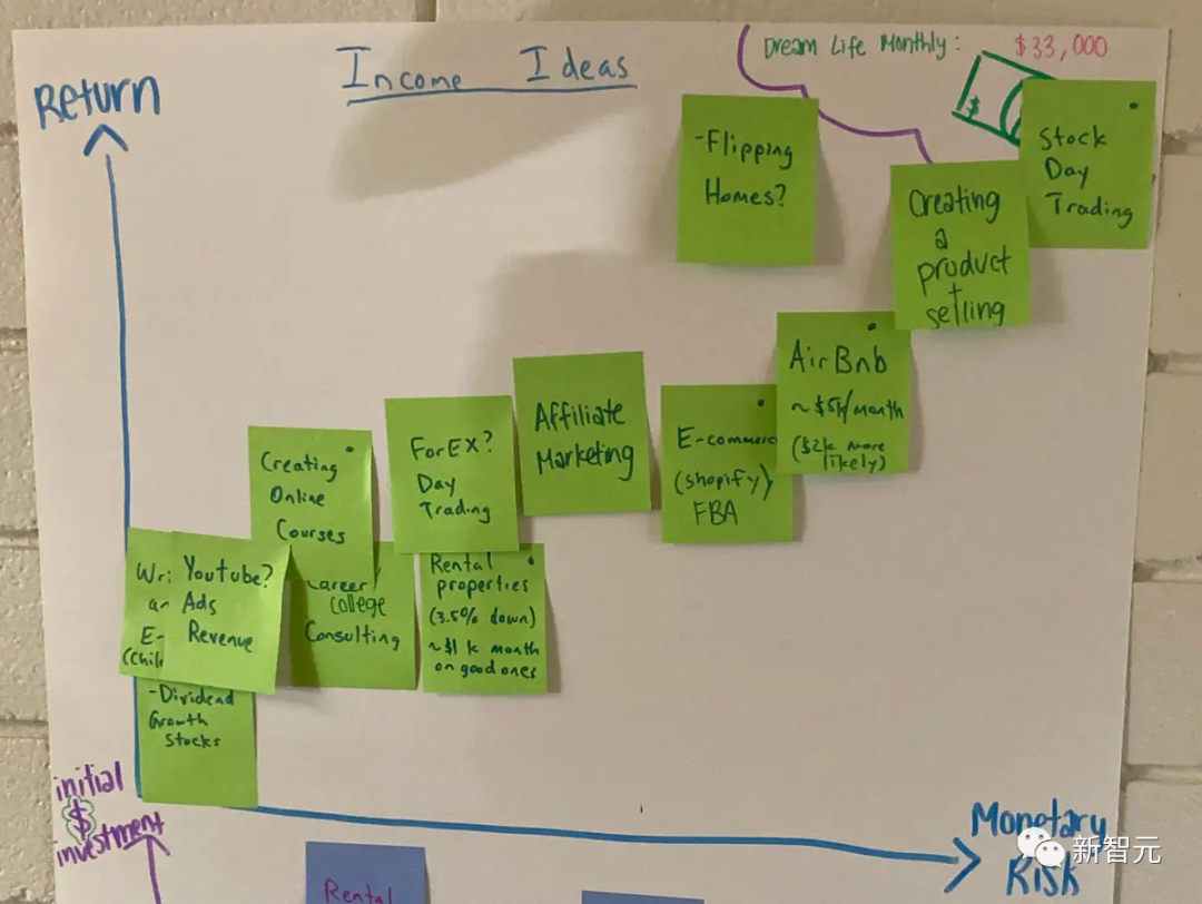 有一天晚上,两人集思广益,在白板上试着写出所有能挣钱的办法——运货、品牌联盟营销、房地产。