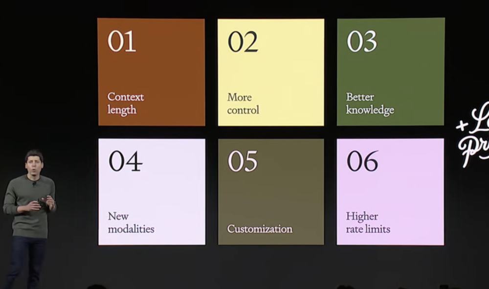 OpenAI这一次并没有将GPT的智能化提升到下一阶段,而是选择补全“短板”,或者说,通过产品体验升级从而吸引更多用户。一个直接的例证就是,OpenAI决定将API体系全面降价,GPT-4 Turbo的输入价格降低三倍,新价格为每千个tokens一美分,输出价格降低两倍,新价格为每千个tokens三美分。山姆·奥特曼在发布会现场表示,GPT-4 Turbo总体费率比GPT-4便宜了2.75倍以上。