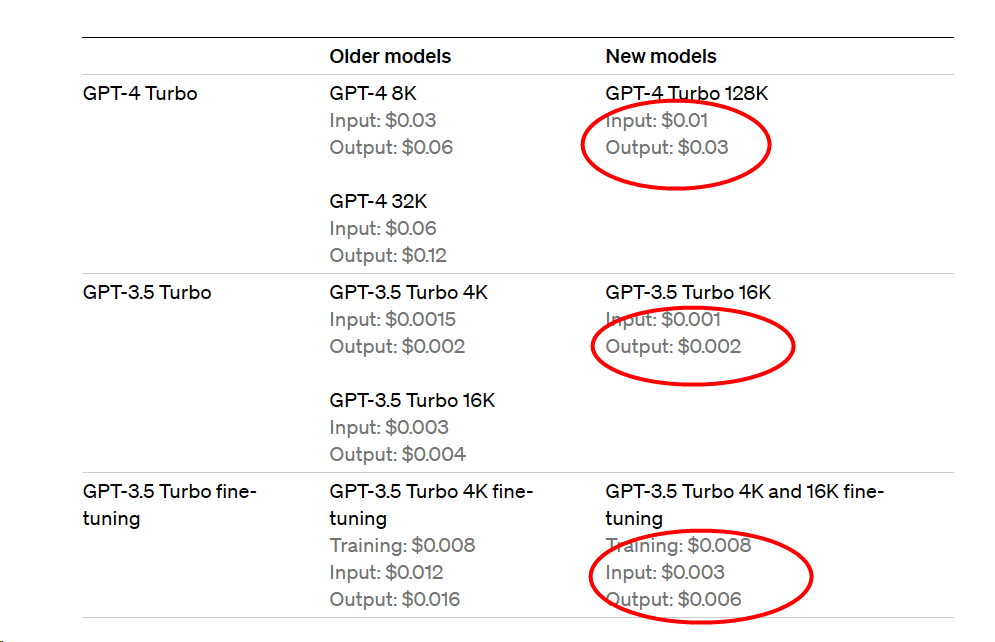 这就意味着,OpenAI通过此举就可以一下让原来的价格降下来一半还多。与 GPT-4 相比,GPT-4 Turbo的输入tokens价格降到了1/3,输出tokens价格则降到了一半。