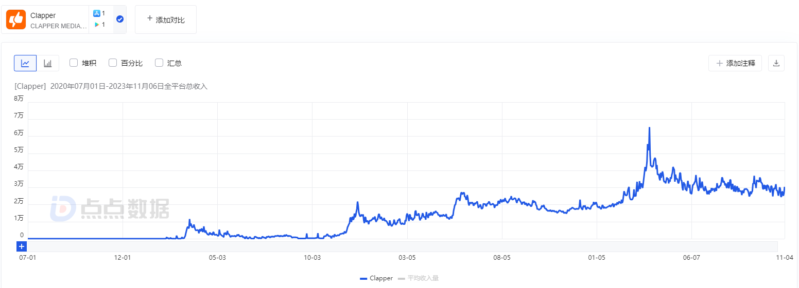 根据点点数据,2023 年 3 月,Clapper 下载量激增,当月双端内购收入就从 2 月份的不到 85 万美金,增长到了 130 万美金。现在大半年过去了,Clapper 的月度收入一直保持在 110 万美金以上。