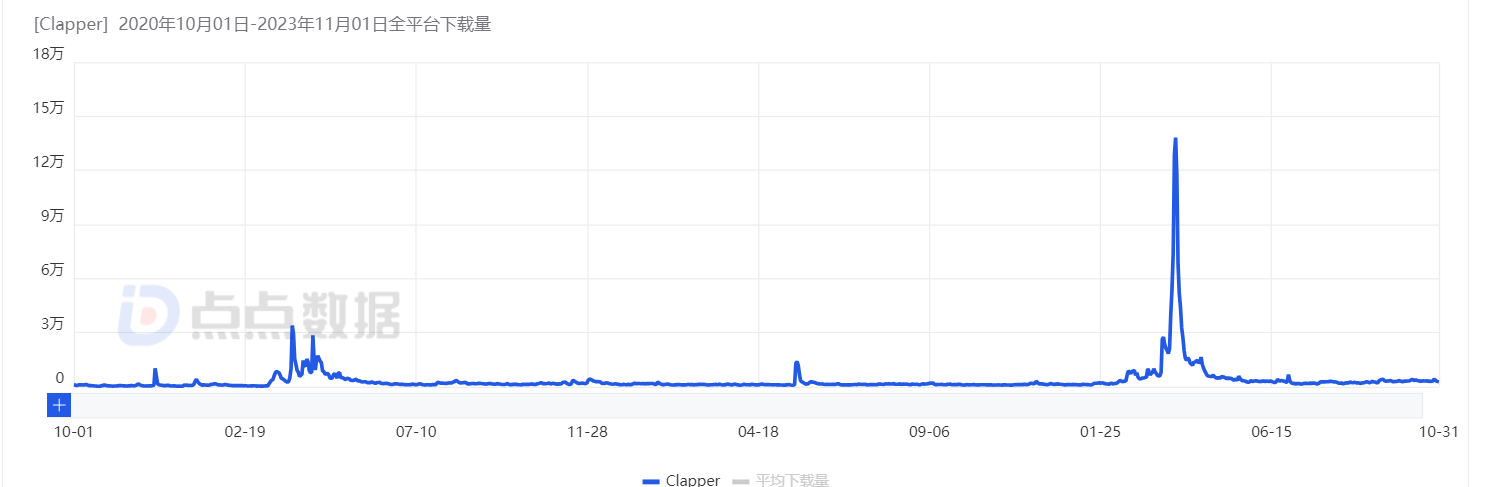 根据点点数据,除了 2023 年 3 月下载量快速增长,Clapper 的双端日均下载量不超过 4000,自 App 上线以来,全球累计下载量不到 500 万。