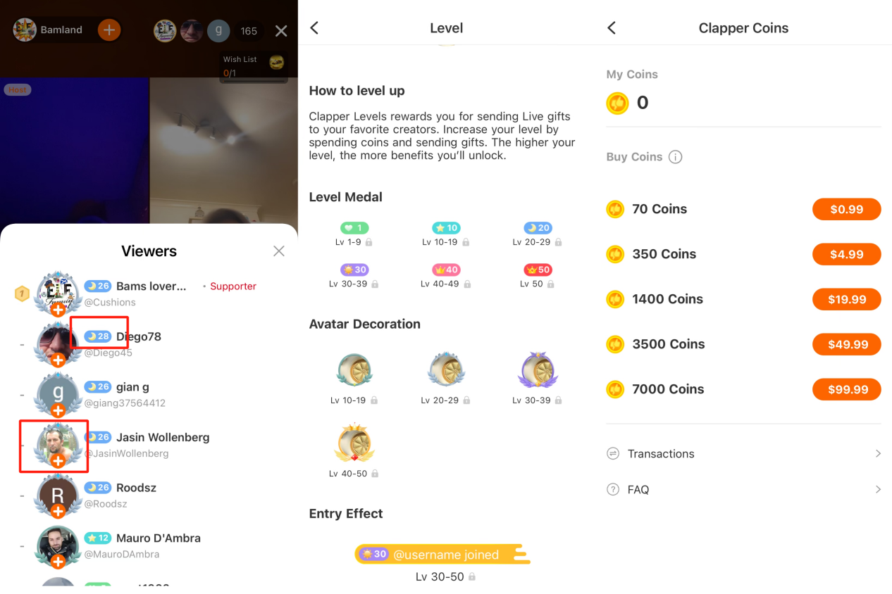 Clapper 用不同颜色来划分观众等级,等级不同,解锁权益不同(例如彰显等级的头像边框,进入直播间时能被所有观众看到的专属特效)