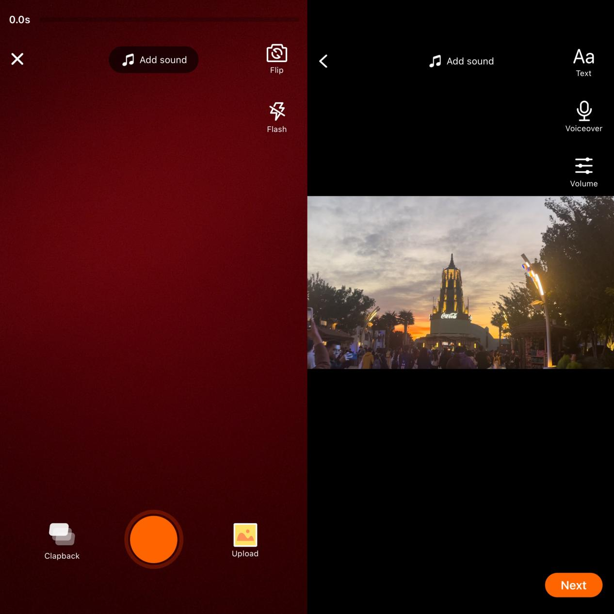 在发布视频功能下,与 TikTok 完全相反,Clapper 没有短视频模板、滤镜或者热门挑战推荐,用户只能随手拍或上传已有视频,最多加一个背景音乐和文字,鼓励最真实的内容。这对年龄偏大,适应不了复杂玩法的人群十分友好。