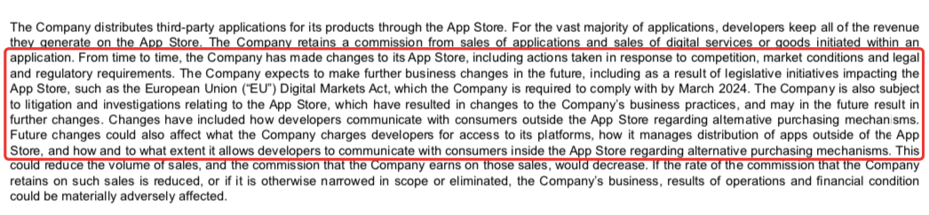 如今,随着上市公司正式文件的流出,苹果也即将展示出自己的“新面孔”,尽管这看上去有些“阵痛”。苹果在文件中指出,未来的变化可能会影响其向开发者收取访问平台费用以及如何管理 App Store 以外的应用分发方式。此外,如果苹果从 App Store 中获得的佣金减少,公司的业务、经营业绩和财务状况可能会受到很大的不利影响。
