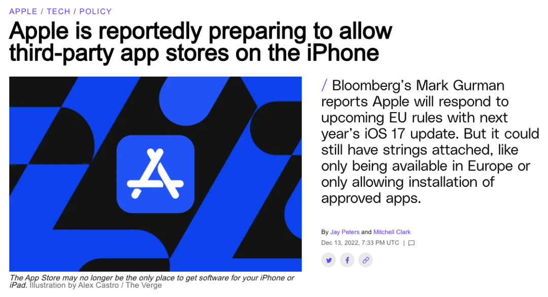 在欧洲,App Store 一直以来打造的“围墙花园”(用户必须从官方商店才能下载 App),即将成为过去式。
