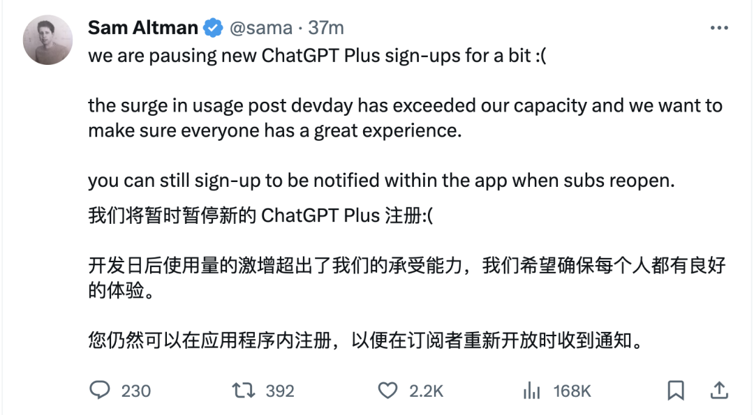OpenAI的CEO Sam Altman宣布暂停ChatGPT Plus 新用户注册!