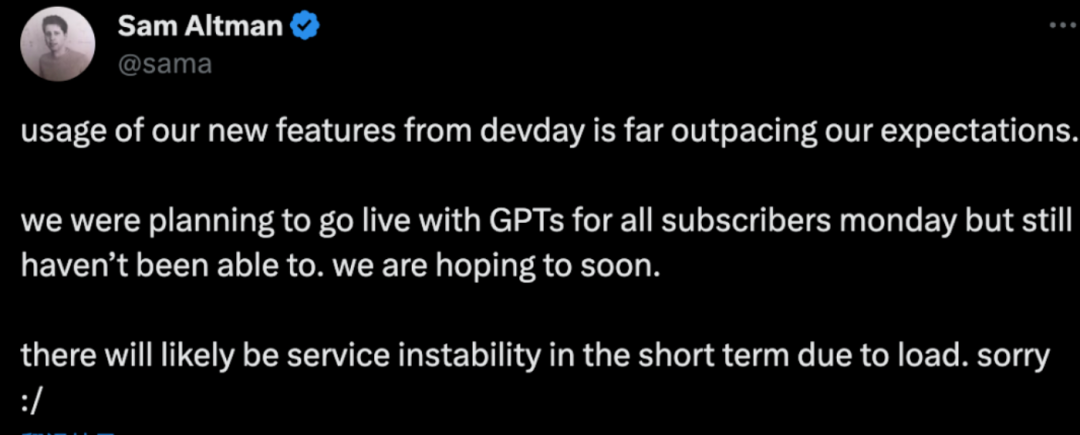 Sam Altman还下场亲自道歉说是因为太受欢迎导致服务器负载超荷。