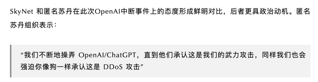 后来有外媒透露,最近ChatGPT崩溃不止是负载的问题;其背后的攻击似乎是 SkyNet 和匿名苏丹组织之间的合作。
