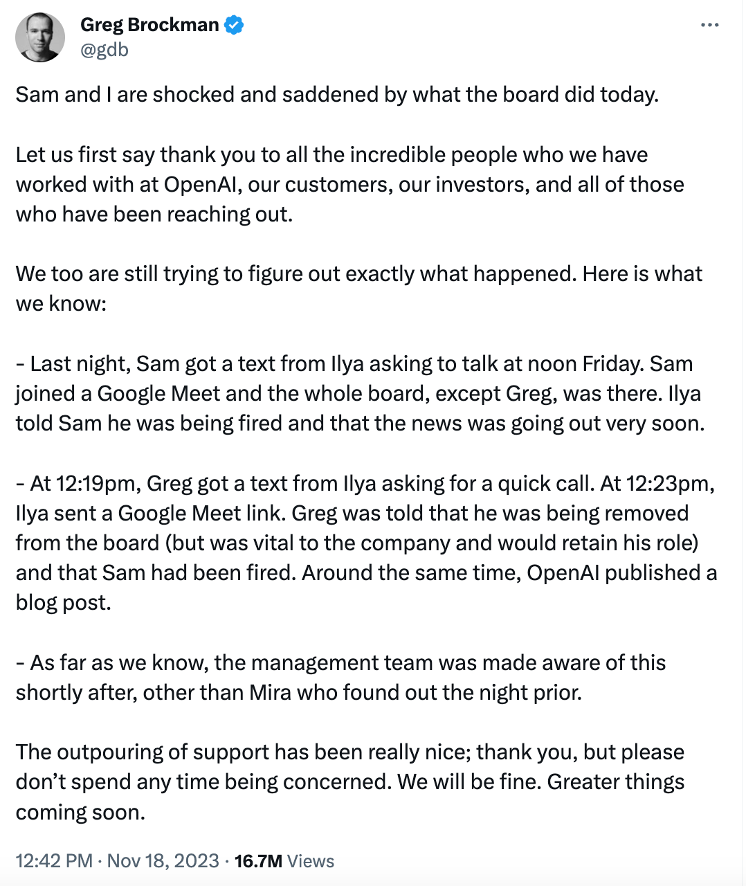 Greg Brockman在推文中揭示了政变真相——OpenAI首席科学家Ilya Sutskever在Altman和Greg不在场的情况下“召开了董事会议”,解雇了Altman,并且把Greg从董事会剔除。