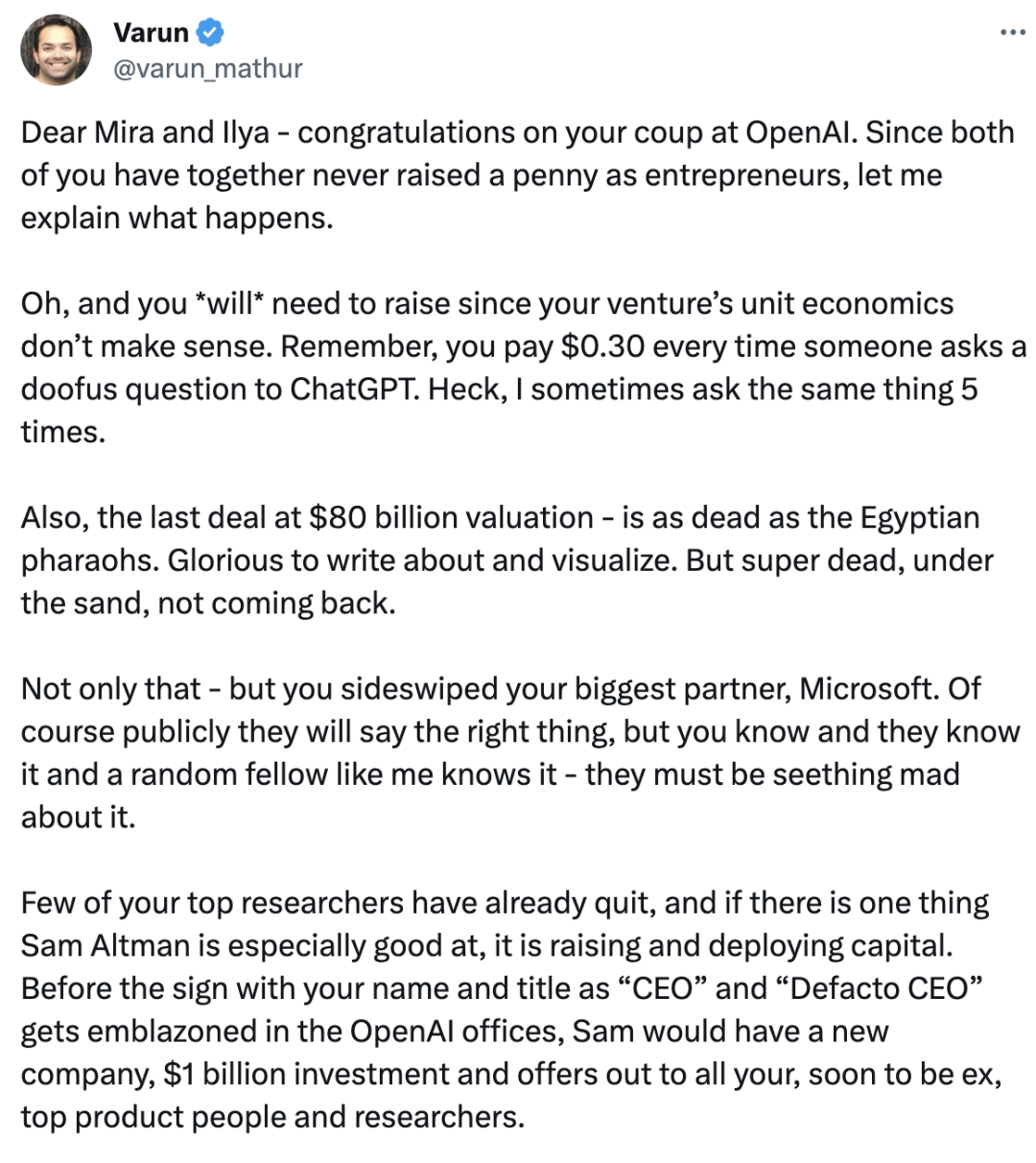 你们的几位顶尖研究员已经辞职了,而如果有一件事Sam Altman特别擅长,那就是筹集和运用资本。在你们的名字和“CEO”头衔被镌刻在 OpenAI 办公室之前,Sam将建立一家新公司,并轻松获得10亿美元的投资,并向所有OpenAI的顶尖产品经理和研究员发出邀请。