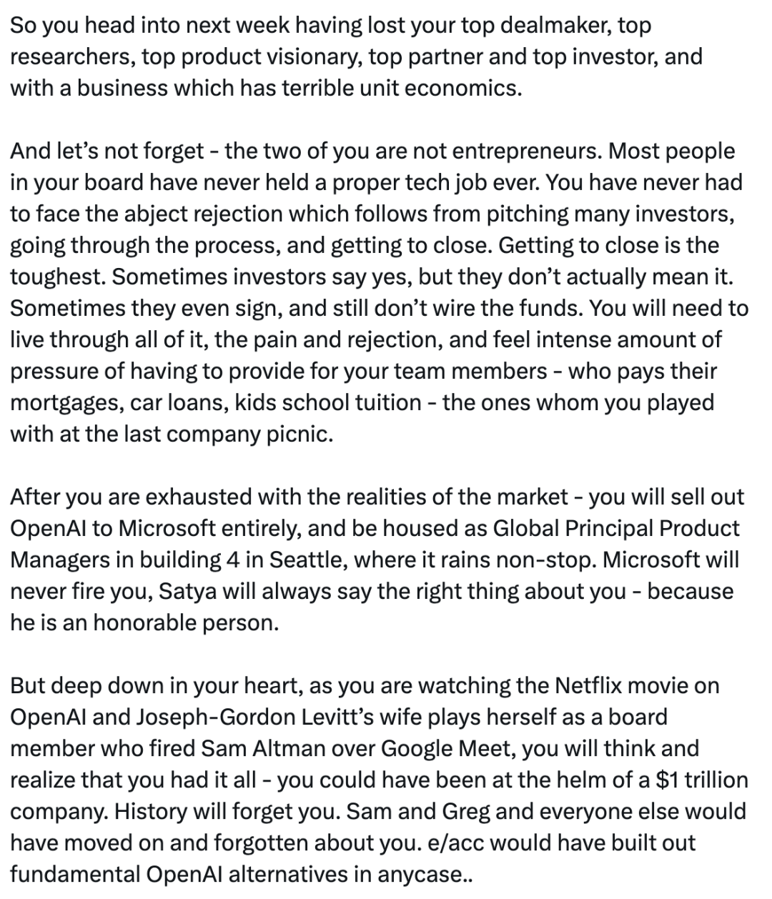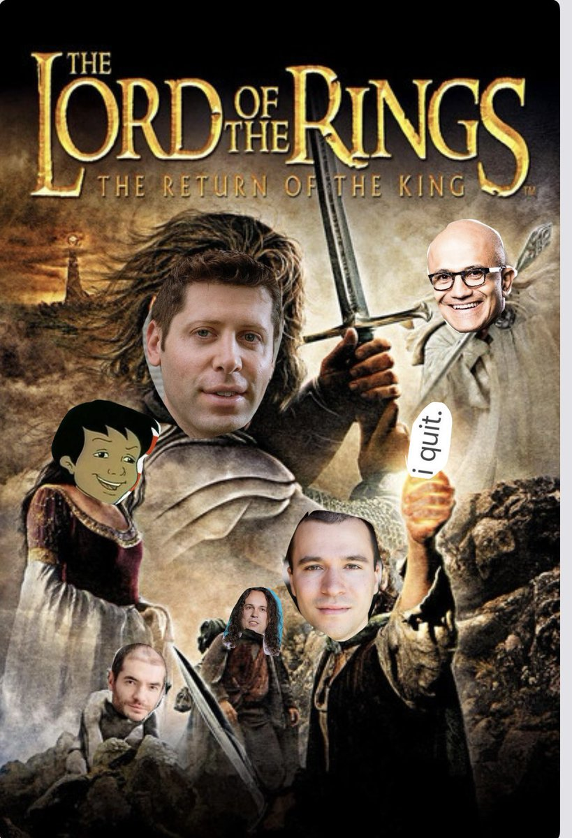 当你们对市场的现实感到疲惫不堪之后,你们将把OpenAI完全卖给微软,并作为全球首席产品经理被安置在西雅图的4号楼,那里的雨一直下个不停。微软永远不会解雇你,萨蒂亚总是会说你的正确的话,因为他是一个值得尊敬的人。