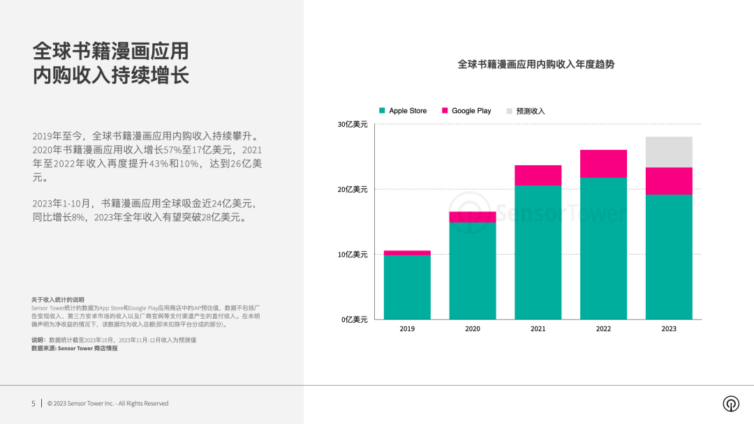 2019 年至今,全球书籍漫画应用内购收入持续攀升。2023 年 1-10 月,书籍漫画应用全球吸金近 24 亿美元,同比增长 8%,2023 年全年收入有望突破 28 亿美元。