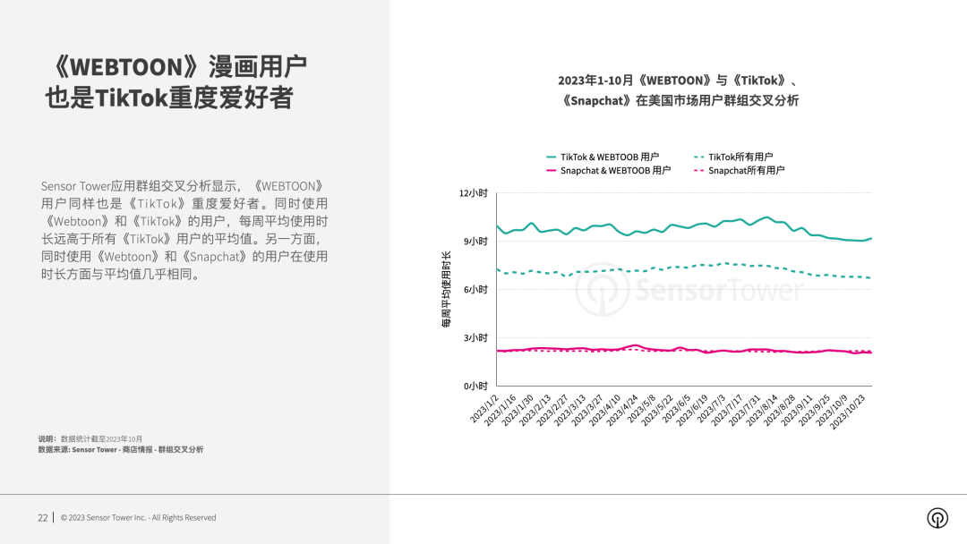 与此同时,根据 Sensor Tower 应用群组交叉分析,WEBTOON 用户同样也是 TikTok 重度爱好者,同时使用 WEBTOON 和 TikTok 的用户,每周平均使用时长远高于所有 TikTok 用户的平均值。