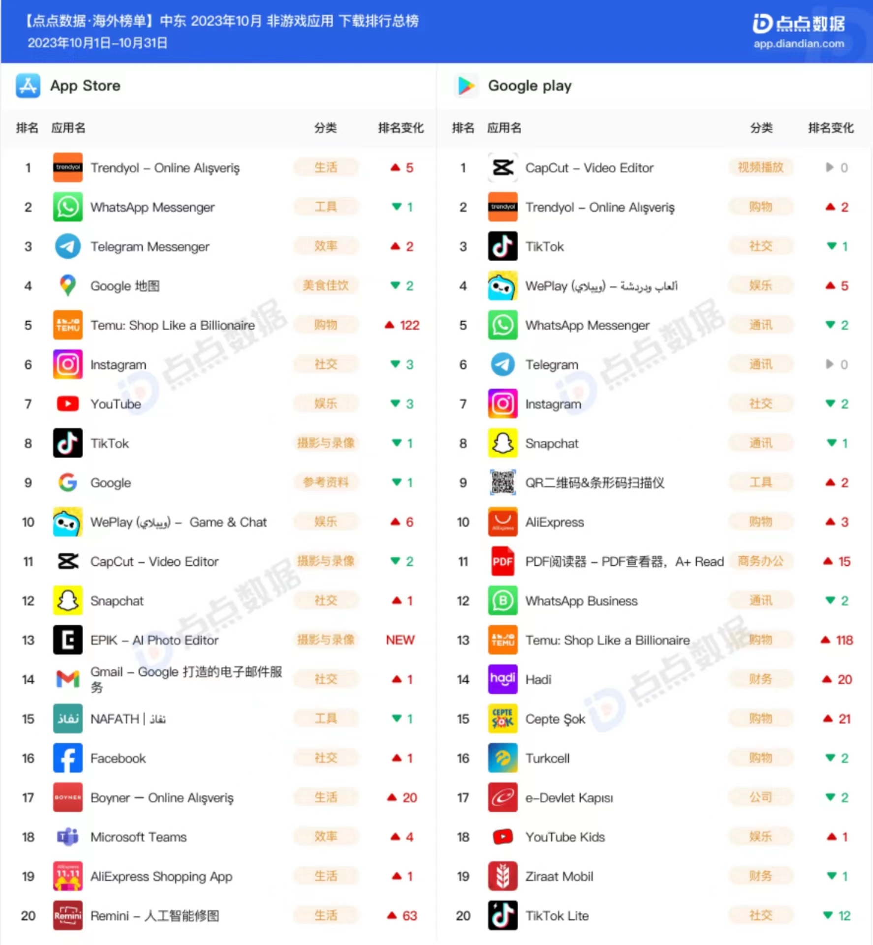 同样受到双十一热度加持,来自国内的电商应用也在同步进行的折扣活动中迎来了下载量的增长,其中拼多多海外版 Temu 来势汹汹,双平台下载排名上浮过百上榜。此外,本土电商应用也不得不被“卷入”折扣潮中,Cepte Şok、Turkcell 等多款应用在应用下载榜中的排名都有明显上升。
