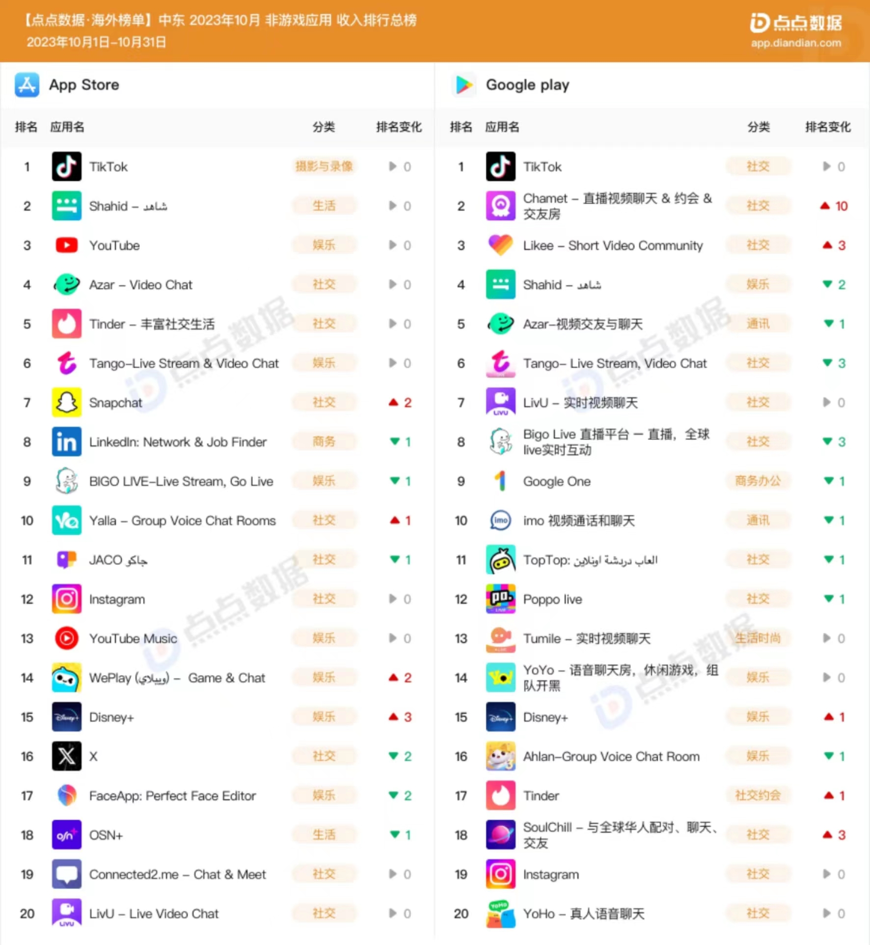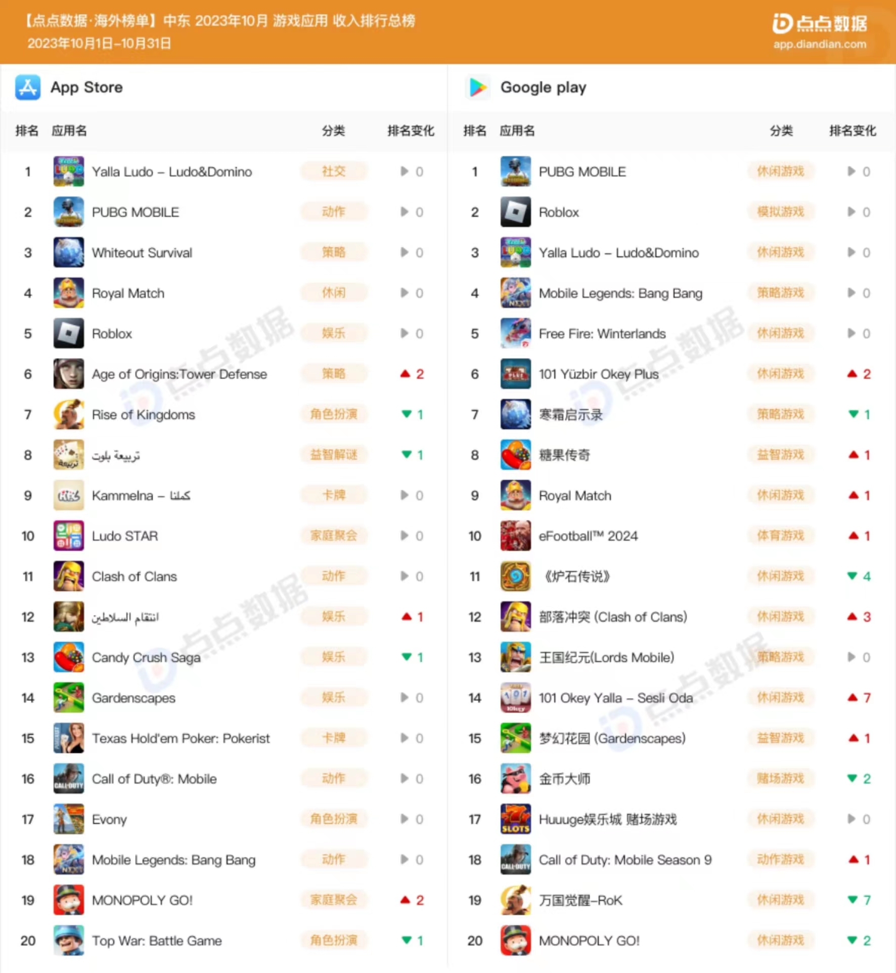 依托互联网移动应用大数据平台“点点数据”,点点出海基于中东地区 App Store 和 Google Play 两大应用市场,分别整理下载榜和收入榜 Top20 应用&游戏,希望帮助从业者更好地了解海外最新的产品趋势和变化。