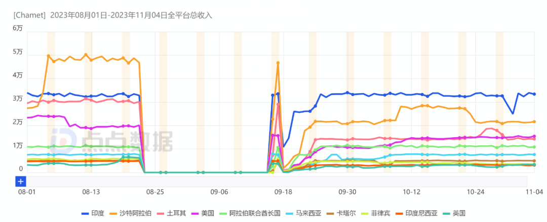 排名幅度情况来看,杭州富聊科技旗下 1v1 视频交友社交应用 Chamet 上月在中东地区的预估收入明显回升,其在 Google Play 应用收入榜的排名一举上重回第二名。该应用 10 月在中东地区单平台预估收入超过 151 万美元,环比 9 月上浮超过 183%。而从该应用全球预估收入的各地区变化趋势来看,其收入回暖也得益于在 9 月重新上线后中东的几个主要收入来源占比地区和国家的“重新连接”,但单以该应用在沙特阿拉伯的收入趋势来看,却仍然未回到应用下架前的收入数据水平。