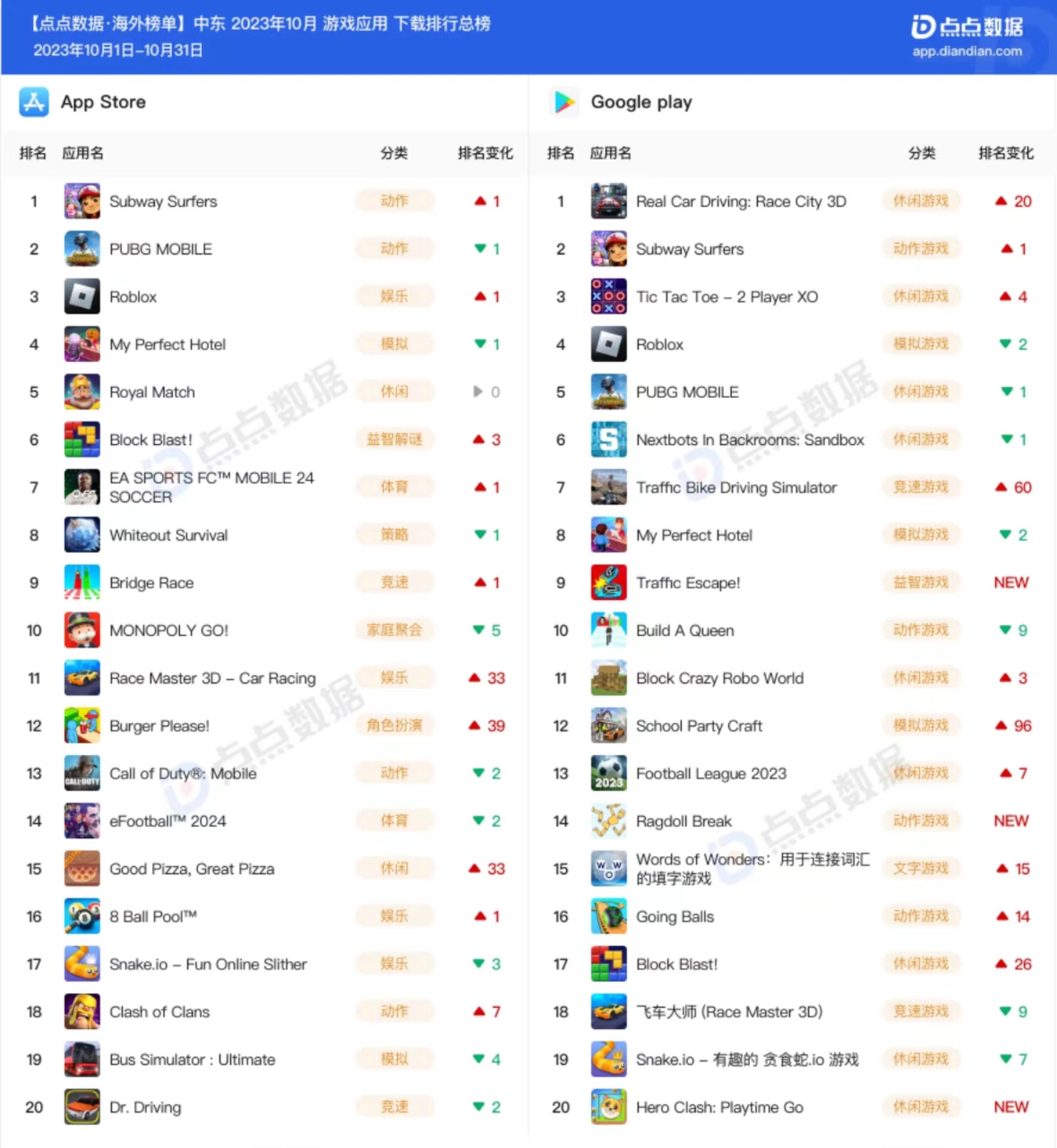 与此同时,10 月还有数款手游在下载榜排名有明显上浮,App Store 这边两款玩法不同的餐厅模拟经营游戏《Burger Please!》及《Good Pizza, Great Pizza》本月下载量回暖进入到下载榜前 20,Google Play 这边解压木人傀儡游戏《Ragdoll Break》及视角旋转还原目标影子游戏《Hero Clash: Playtime Go》上月也是新晋上榜。
