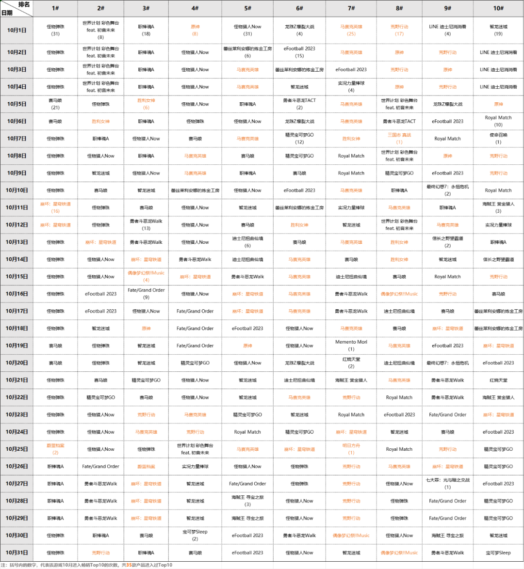 2023 年 10 月份的日本 iOS 畅销榜冠军持续着激烈的竞争,总共只有 5 款产品有过单日登顶的经历,其中 2 款为国产手游。
