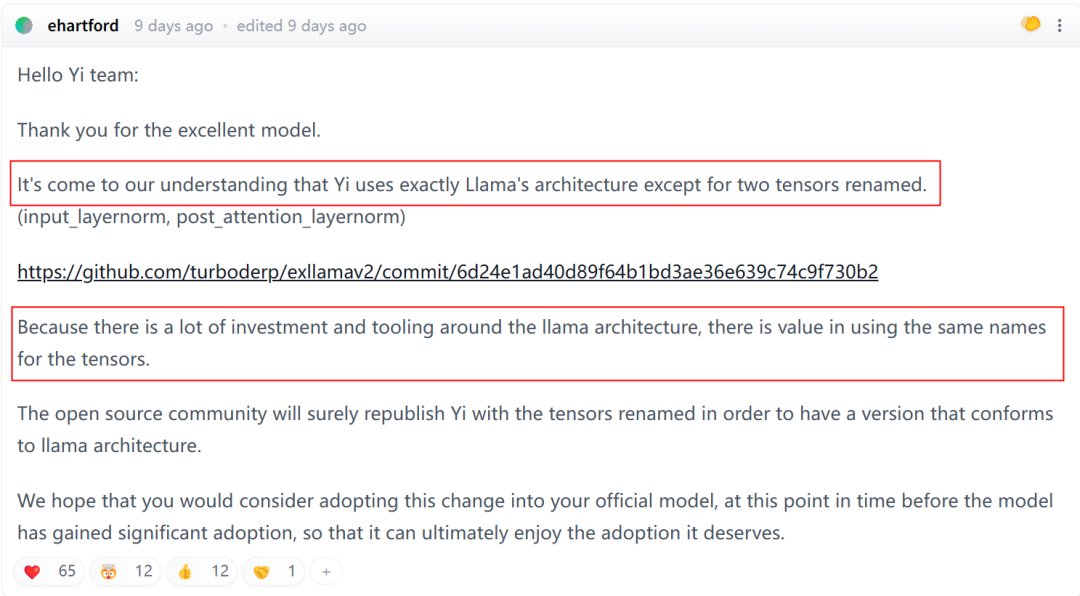 一位署名为ehartford的开发者于9天前在社区留言。他首先指出,据其了解,Yi 使用的正是 Llama 的架构,除了重新命名了两个张量(input_layernorm,post_attention_layernorm)。