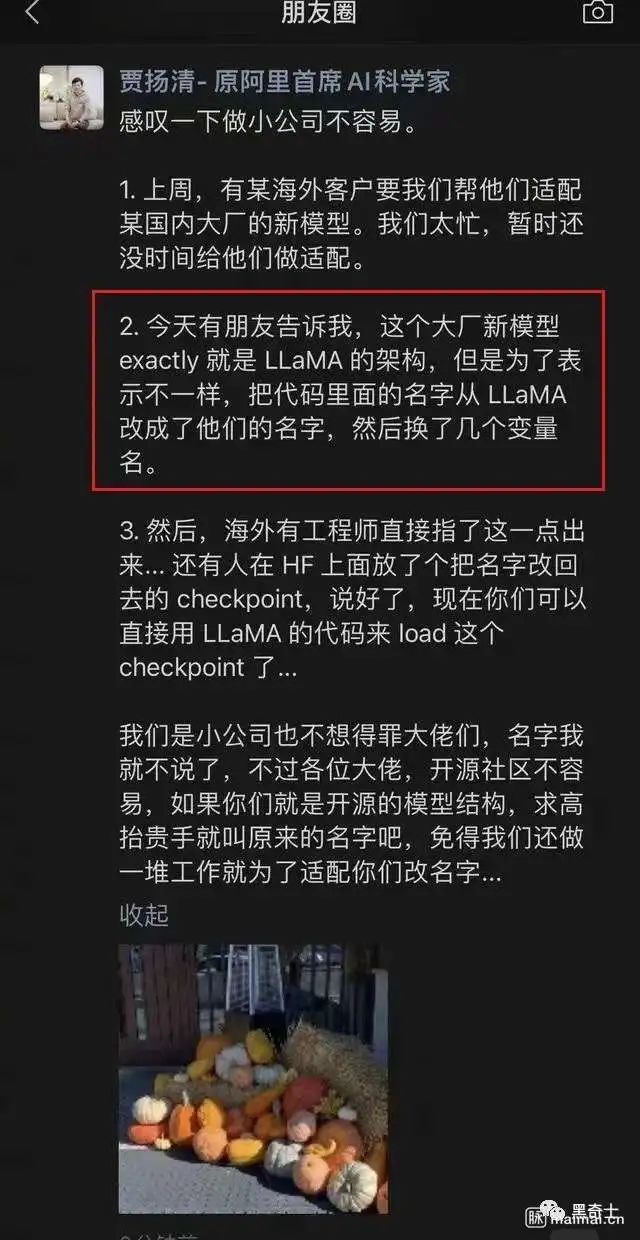 随后又有热心网友挖出了前阿里VP贾扬清在朋友圈发的一张图,直言某国产大模型实际上是抄袭的LlaMA,为表示不一样就更换了几个变量名。甚至还犀利讽刺道:如果是开源的模型架构,就不要改名字了,“免得我们还做一堆工作就为了适配你们改名字”。虽然贾扬清没有指名道姓,但有留意此事的人不免“对号入座”。