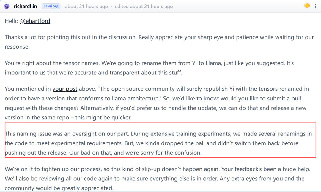 就在昨天,其团队开源总监 Richard Lin 在Hugging Face社区原贴之下指出“命名问题是团队的疏忽,在大量训练实验中,我们对代码进行了多次重命名以满足实验要求。但在发布正式版本之前,我们没能将它们切换回来。对此我们深感抱歉,由此造成的混乱我们也深表歉意”。