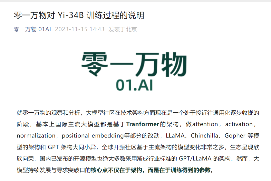 正如零一万物在今天下午发布的公告所表达的:大模型持续发展与寻求突破口的核心点不仅在于架构,而是在于训练得到的参数。