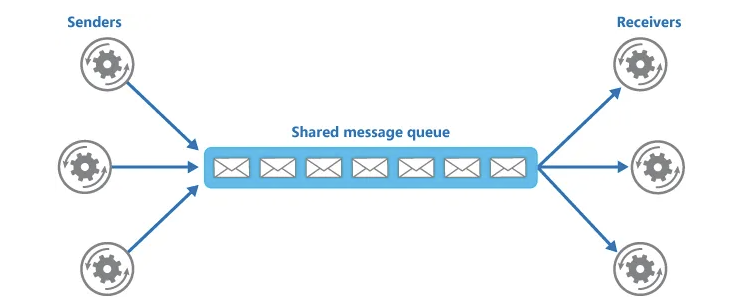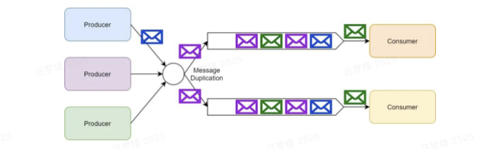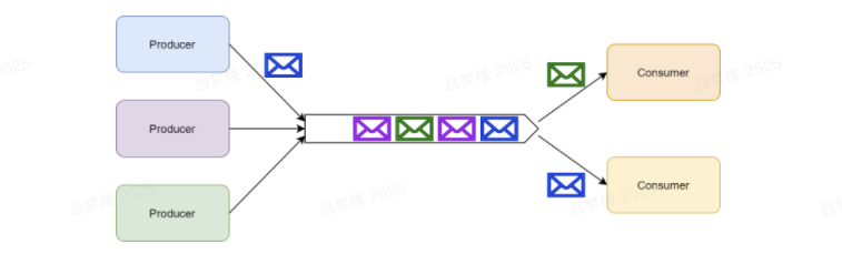 点对点模式:多个生产者可以向同一个消息队列发送消息,一个具体的消息只能由一个消费者消费。