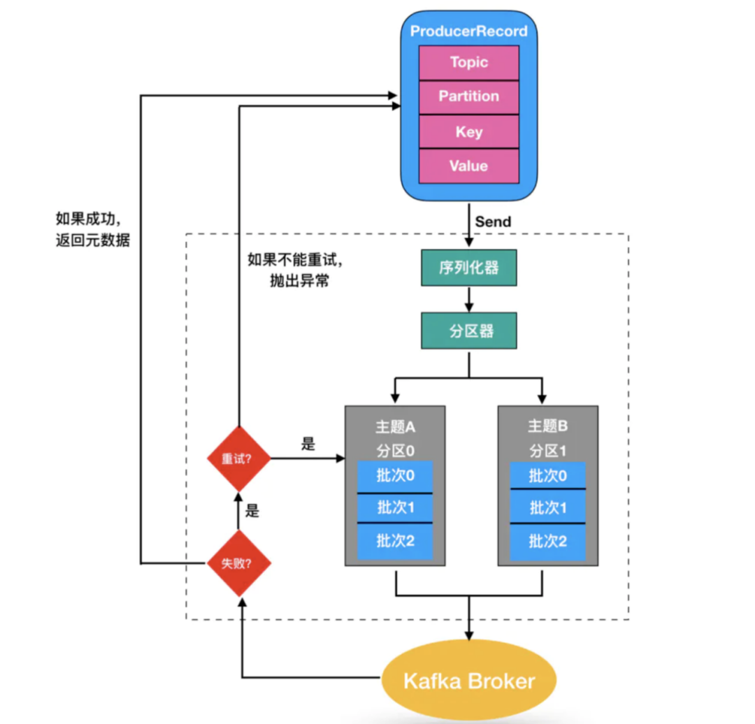 相同主题和分区的消息,会被存放在同一个批次里,然后由一个独立的线程负责把它们发到 Kafka Broker 上。