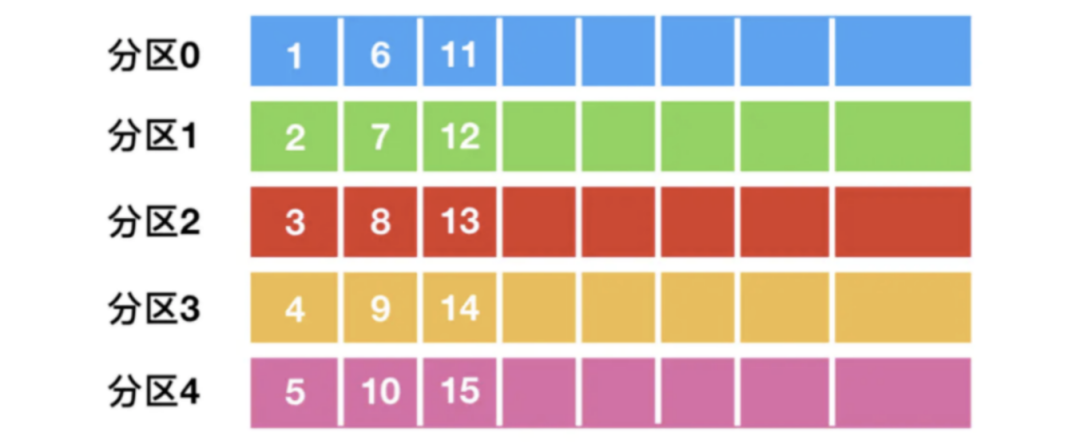 分区是 Kafka 读写数据的最小粒度,比如主题 A 有 15 条消息,有 5 个分区,如果采用顺序轮询的方式,15 条消息会顺序分配给这 5 个分区,后续消费的时候,也是按照分区粒度消费。