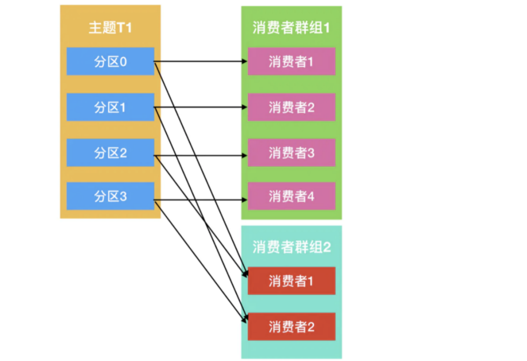 不同的消费群组互不干涉,比如下图的 2 个消费群组,可以分别消费这 4 个分区的消息,互不影响。