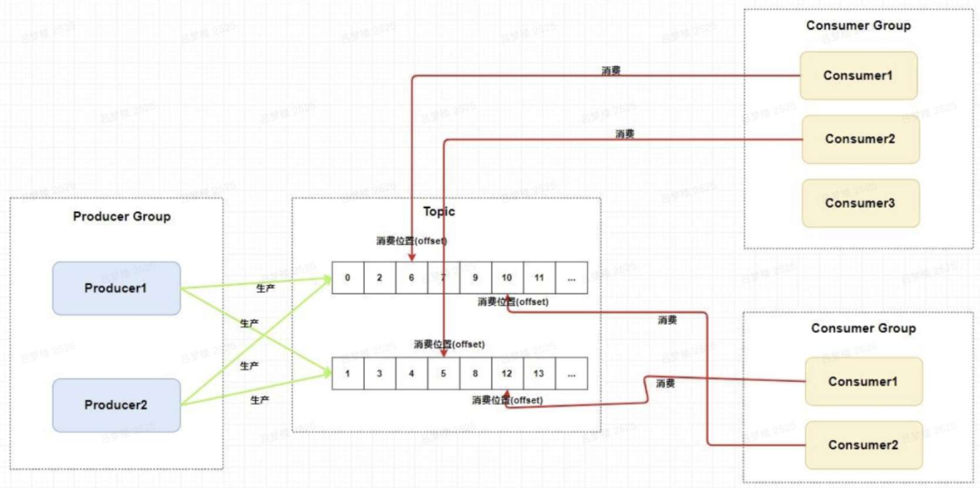 分组(Group):一个组可以订阅多个 Topic,包括生产者组(Producer Group)和消费者组(Consumer Group)。