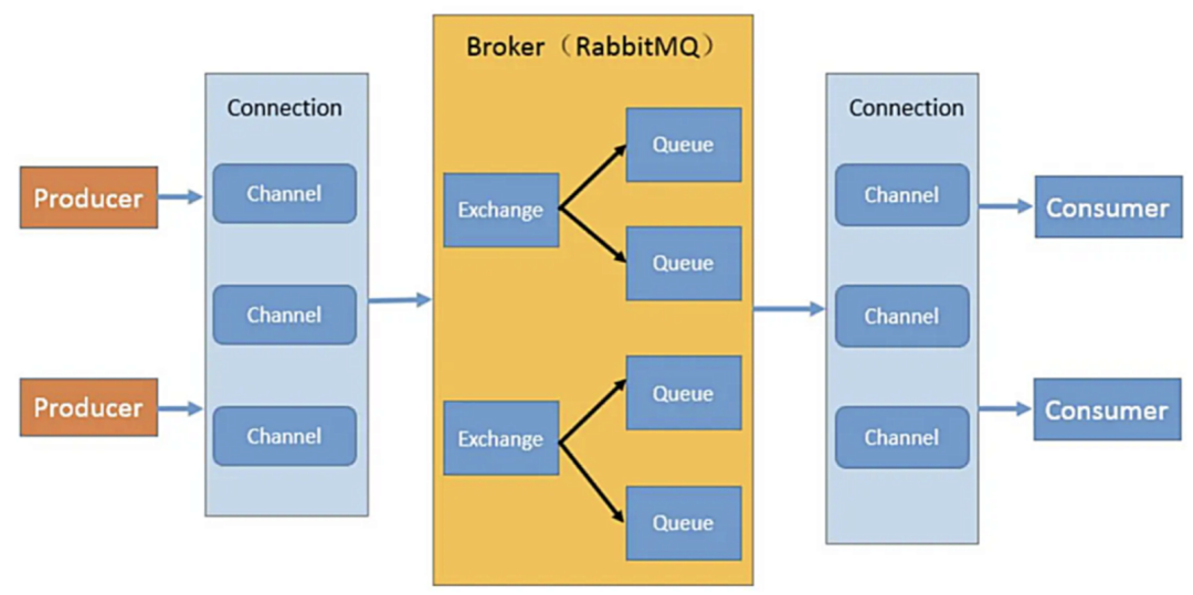 Broker:消息处理中心,负责消息存储、确认、重试等,一般其中会包含多个 Queue;