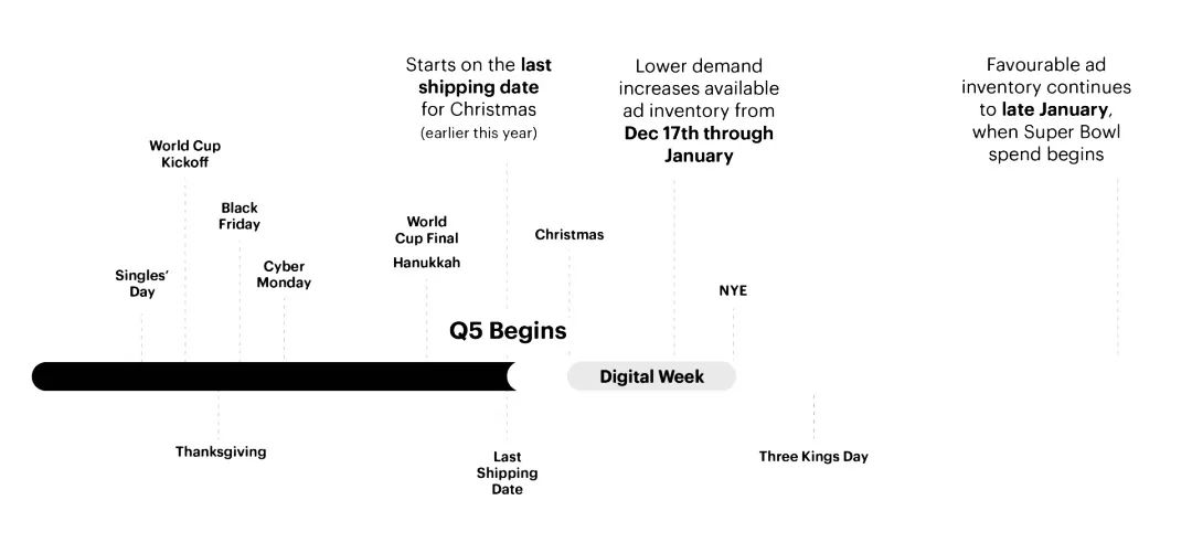 日渐增长的下载量、不断出现的各类应用新秀,都在昭示着应用出海的火热。在应用市场,许多开发者普遍把大量营销预算投入Q4,认知集中于圣诞等假日节点,事实上,Adjust数据表明Q5同样是应用开发者应当好好把握的营销时段。 那么到底什么是Q5?为什么应用出海开发者应该关注Q5?应用出海开发者如何抓住Q5的机遇?本期,光子易PhotonPay就来为您一一解答,助您抓住应用出海黄金季。 一、什么是Q5? 通常,大家会把一年中的每三个月分为一个季度,即一般所说的 Q1-Q4,而Q5则是覆盖了Q4末尾和新一年Q1开头的一个概念,主要指一年的圣诞节后到次年1月下旬这一个时间段。 图片来源:网络 这一时期圣诞节大促的余热还未褪去,广告的覆盖成本却在下降,消费者仍在寻找优惠信息,此时开展营销活动的边际效益递增,可用更低的成本获取更多用户的关注。在这样的背景下,Q5 所代表的营销新机遇,可能正是应用出海开发者们应该投入关注的机会点。 二、为什么应用出海开发者要关注Q5? 第一,Q5时期的CPM较低,开发者可以在不消耗过多预算的前提下,测试并了解不同渠道吸引目标受众的效果,更精准地作出营销规划。 第二,由于众多开发者的营销关注点都放在了节前高峰期,因此,相关应用开发者可以抓住Q5的机遇,以更加低廉的成本吸引新用户。另外,此时的 "用户注意力争夺战" 也有所缓和,应用更容易脱颖而出,发挥更大的影响力。 第三,Q5期间节假日较多,在节假日期间,消费者的闲暇时间更多,会更多地刷手机玩游戏、追剧,或趁圣诞节后的促销活动在网上购物。许多人也因为新一年的到来而动力满满,为下一年制定计划,寻找健康和健身、效率和财务预算类软件,帮助自己实现新年目标。 三、应用出海开发者如何抓住Q5机遇? Q5 即将拉开帷幕,应用营销人员应当抓紧时间制定策略,充分利用这个时间虽短但潜力无穷的季度,立足用户行为获得优势。 推出季节性订阅计划 长久以来,订阅一直是应用营销的热门选择。开发者可以考虑根据节假日情况,为用户推出新的订阅套餐或节日试用活动。根据应用具体子类别的不同,可以采用下列订阅方式:无广告畅玩,专属内容,追加功能 (游戏内货币、奖励)等。 推出应用内活动与用户交互 用户留存也应当是 Q5 期间的关注点。开发者可以推出应用内活动与用户产生更多交互,吸引用户回到应用。例如:每周奖励活动、竞赛和挑战、限时优惠、发布新功能或内容等。 精准监测推广活动表现 Q5 比其他季度短,因此营销人员需要更快地了解推广活动表现,才能进行相应的调整,优化广告支出。应用营销人员可以精准监测多个渠道的营销表现,充分理解用户旅程,找到最有价值用户的来源,更快速地做出更明智的决策。 内容参考来源 1.《Unlock Q5 to level up your gaming app》,2022,Adjust. 2.《黄金季来袭!游戏出海如何发掘Q5潜能》,2022,AdjustGmbH. 3.《成本降低,收入攀升,如何抓住Q5营销新机遇》,2023,独立出海联合体. 4.《Q4之后是...Q5?移动应用的黄金季来啦!》,2022,AdjustGmbH.