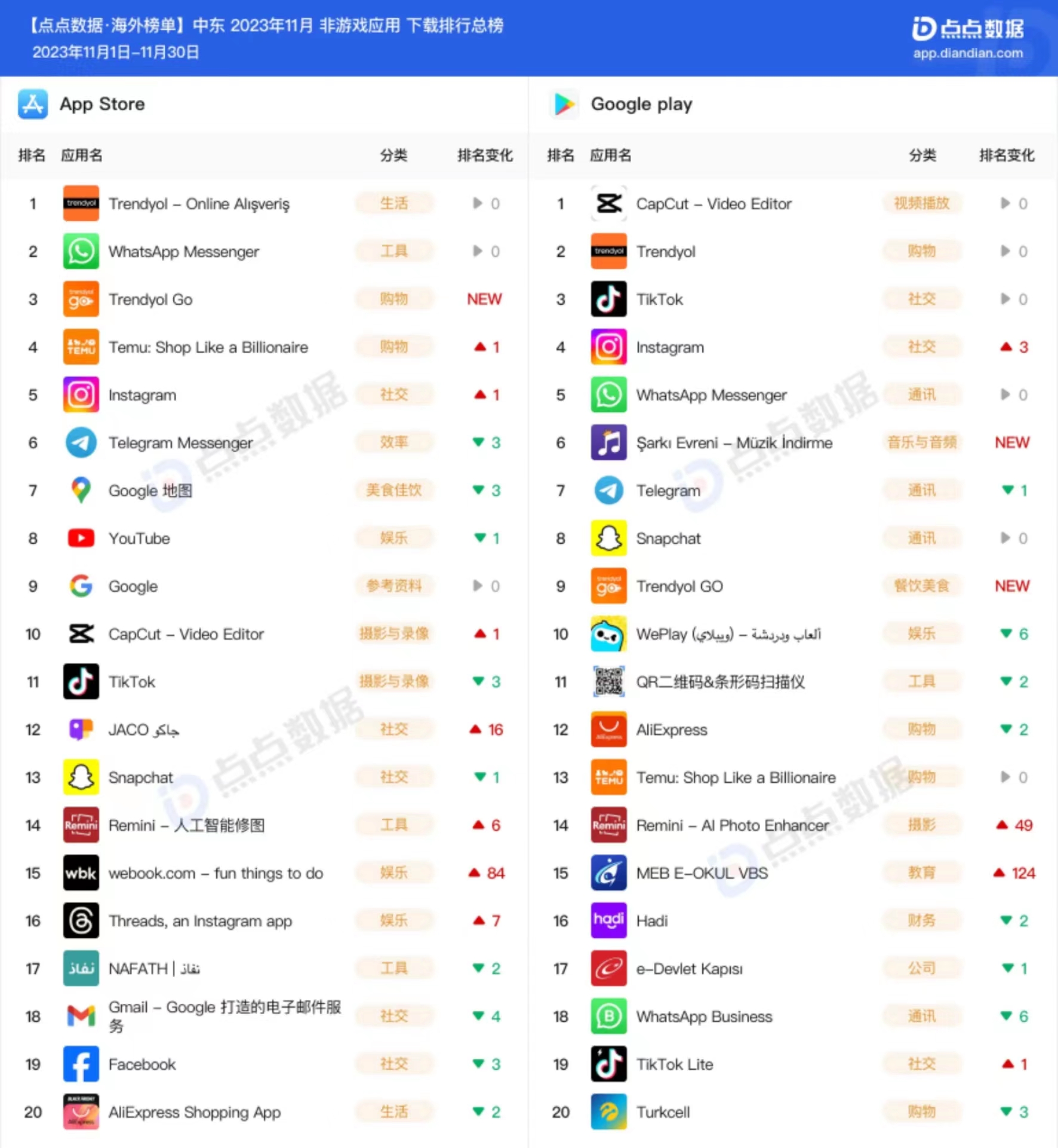 统计周期内,持续受到双十一活动加持,由土耳其 80 后女性创业者 Demet Mutlu 创立的,土耳其领先的电商平台 Trendyol 11 月继续蝉联中东地区应用下载榜冠军,其 11 月下载总量超过 222 万。Google Play 这边,下载榜头名则为短视频剪辑应用 CapCut,其单平台下载量超过 134 万。