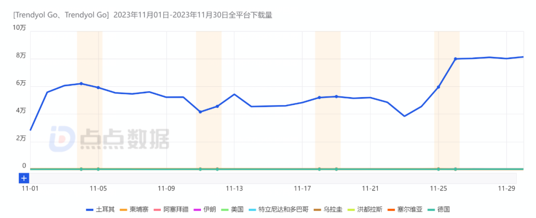 值得注意的是,同属 Trendyol 旗下,承担类似饿了么外卖业务的 Trendyol Go 此前于 10 月上线并在上月下载量骤增一举进入到 App Store 中东地区应用下载榜前三,大规模的折扣券以及新人优惠或许是其下载暴增的原因之一,但本土品牌背书还是为其下载数据添色良多,从下载量来源占比来看,土耳其本土贡献了该应用超过 95% 的下载量。