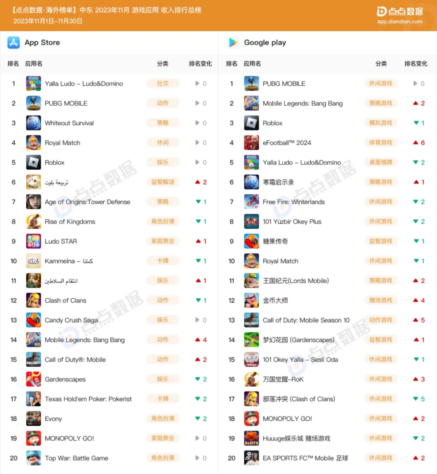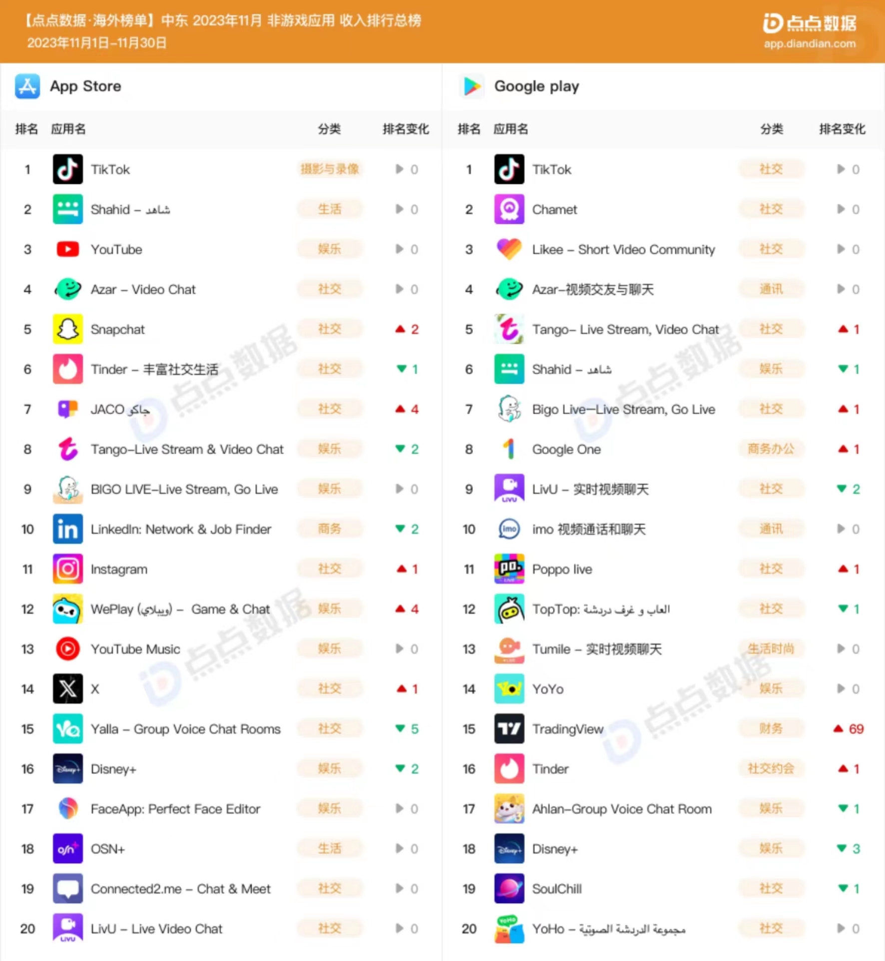 依托互联网移动应用大数据平台“点点数据”,点点出海基于中东地区 App Store 和 Google Play 两大应用市场,分别整理下载榜和收入榜 Top20 应用&游戏,希望帮助从业者更好地了解海外最新的产品趋势和变化。