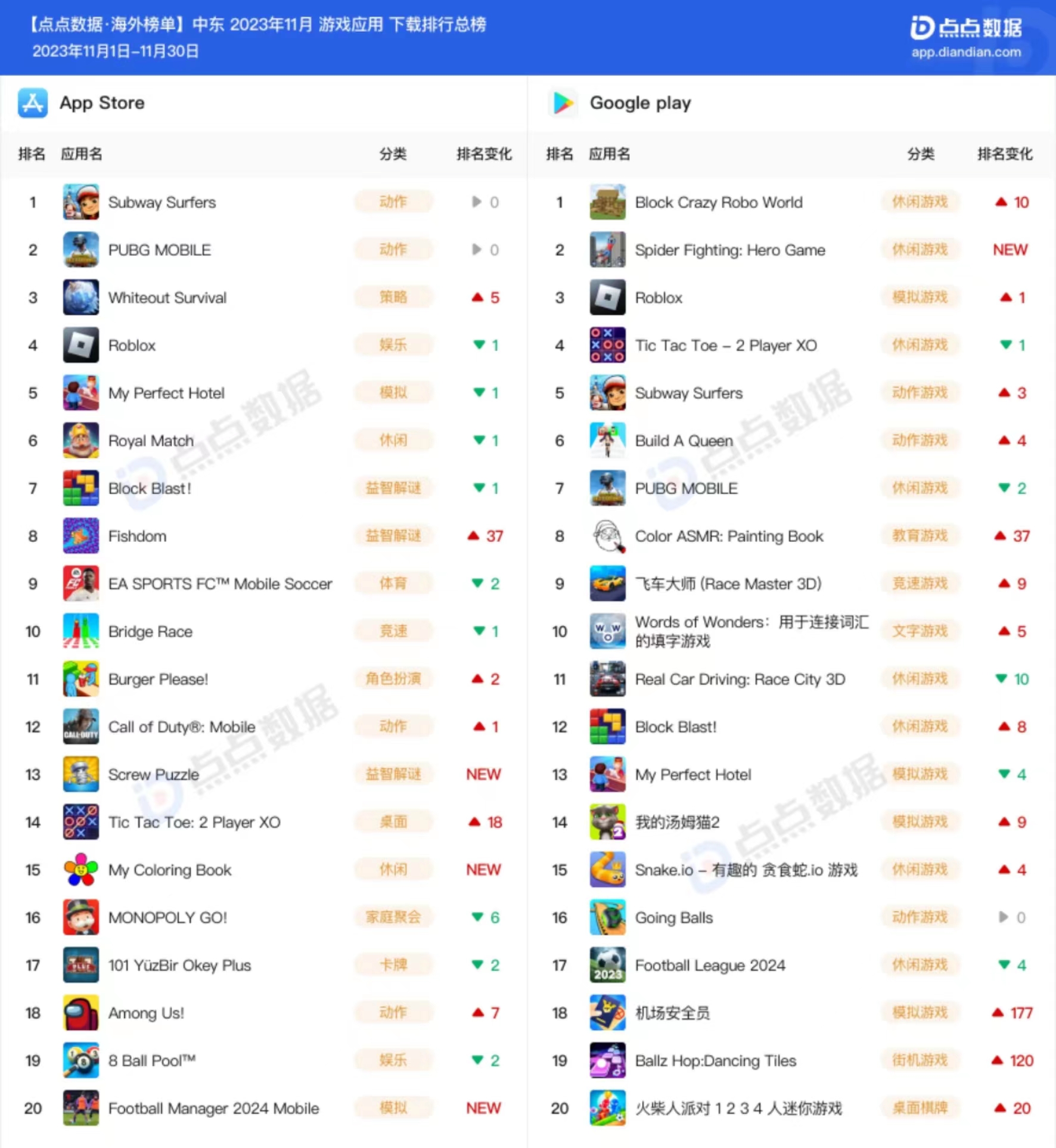 新晋游戏方面,索尼 3A 动作端游《漫威蜘蛛侠2》的“手游简化版本”,由越南游戏厂商 Zego Studio 发行的蜘蛛侠城市格斗游戏《Spider Fighting: Hero Game》上月也在中东地区爆火并拿下了该地区手游下载榜的第二名。App Store 这边,经典拆钉子玩法解谜休闲游戏《Screw Puzzle》在上线一个月后于 11 月上榜。因 TikTok 情侣主题挑战而走红的涂色游戏《My Coloring Book》同样火到了中东地区。Netflix 进军游戏领域的拳头产品之一《Football Manager 2024 Mobile》也在订阅会员免费的加持下获得了较为可观的下载量。