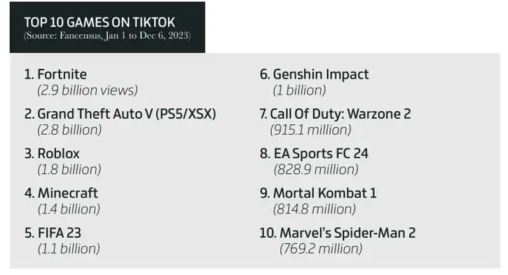 短视频平台 TikTok 上,2023 年最火的前十款游戏包括《堡垒之夜》、《GTA 5》、《Roblox》、《我的世界》和《原神》等。在即将过去的一年里,TikTok 用户观看这些热门游戏视频的总次数都达到了数亿甚至数十亿次。