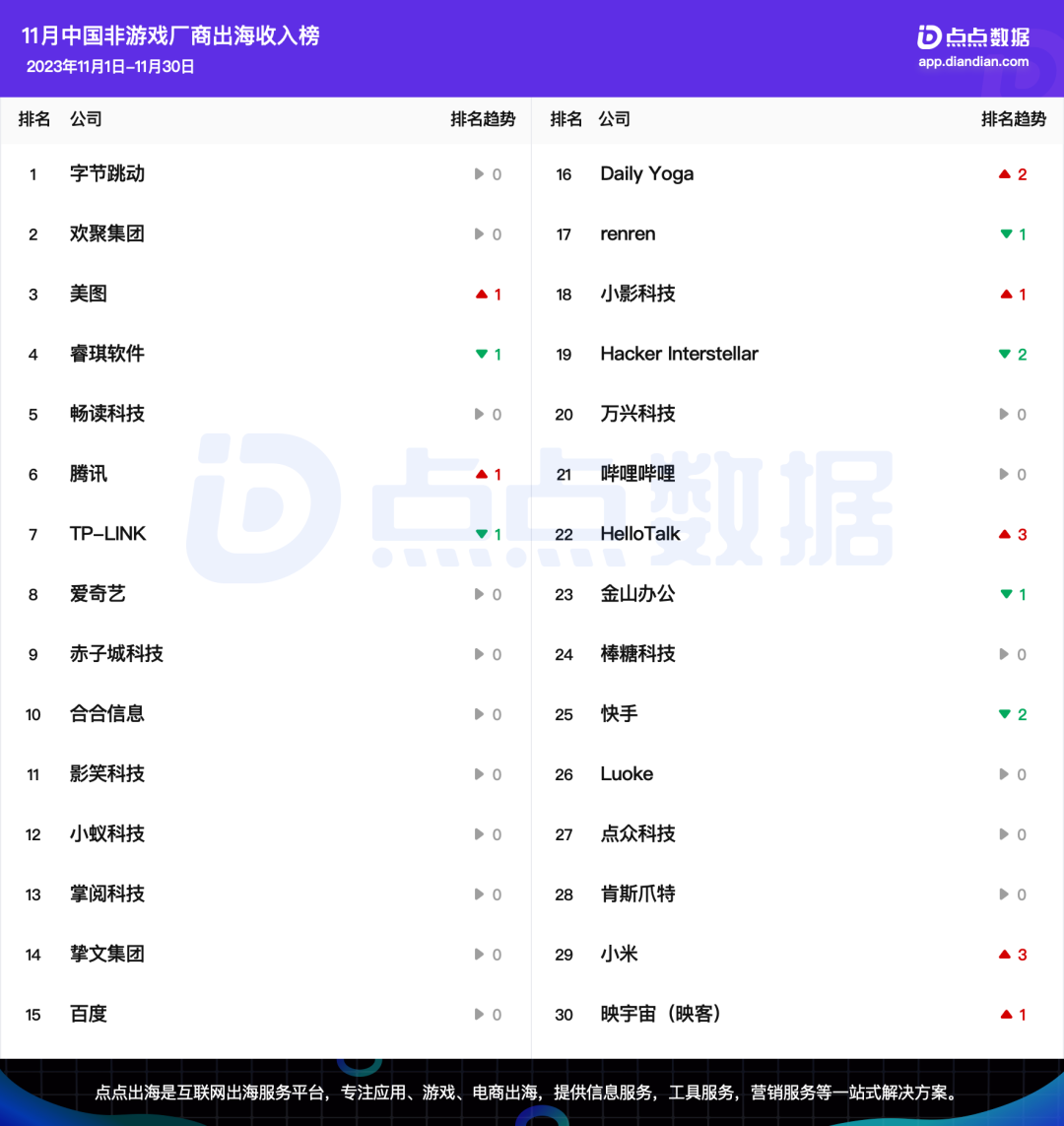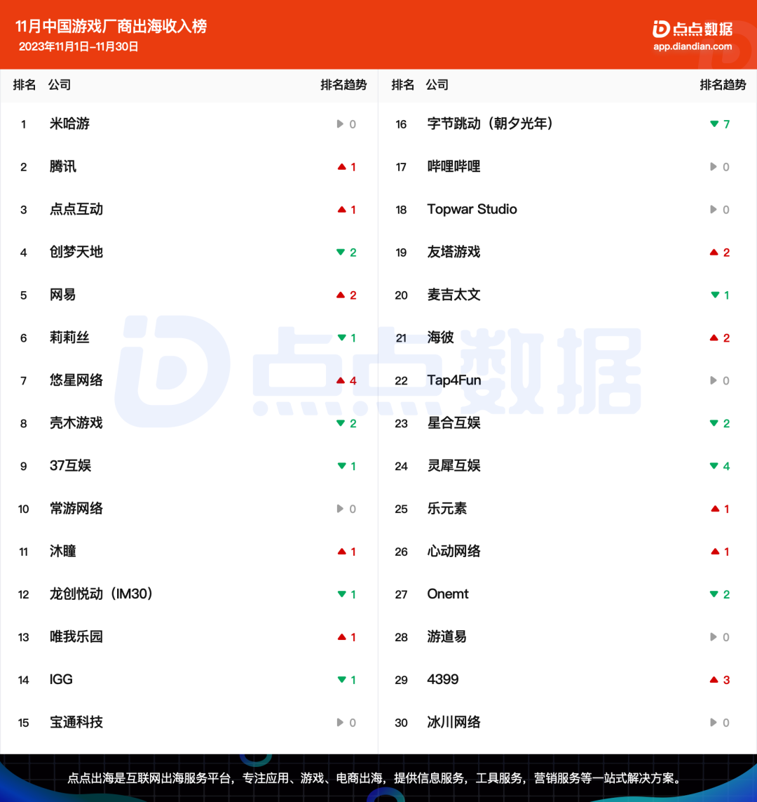 原标题:出海厂商丨2023年11月中国应用/游戏厂商出海收入Top30榜