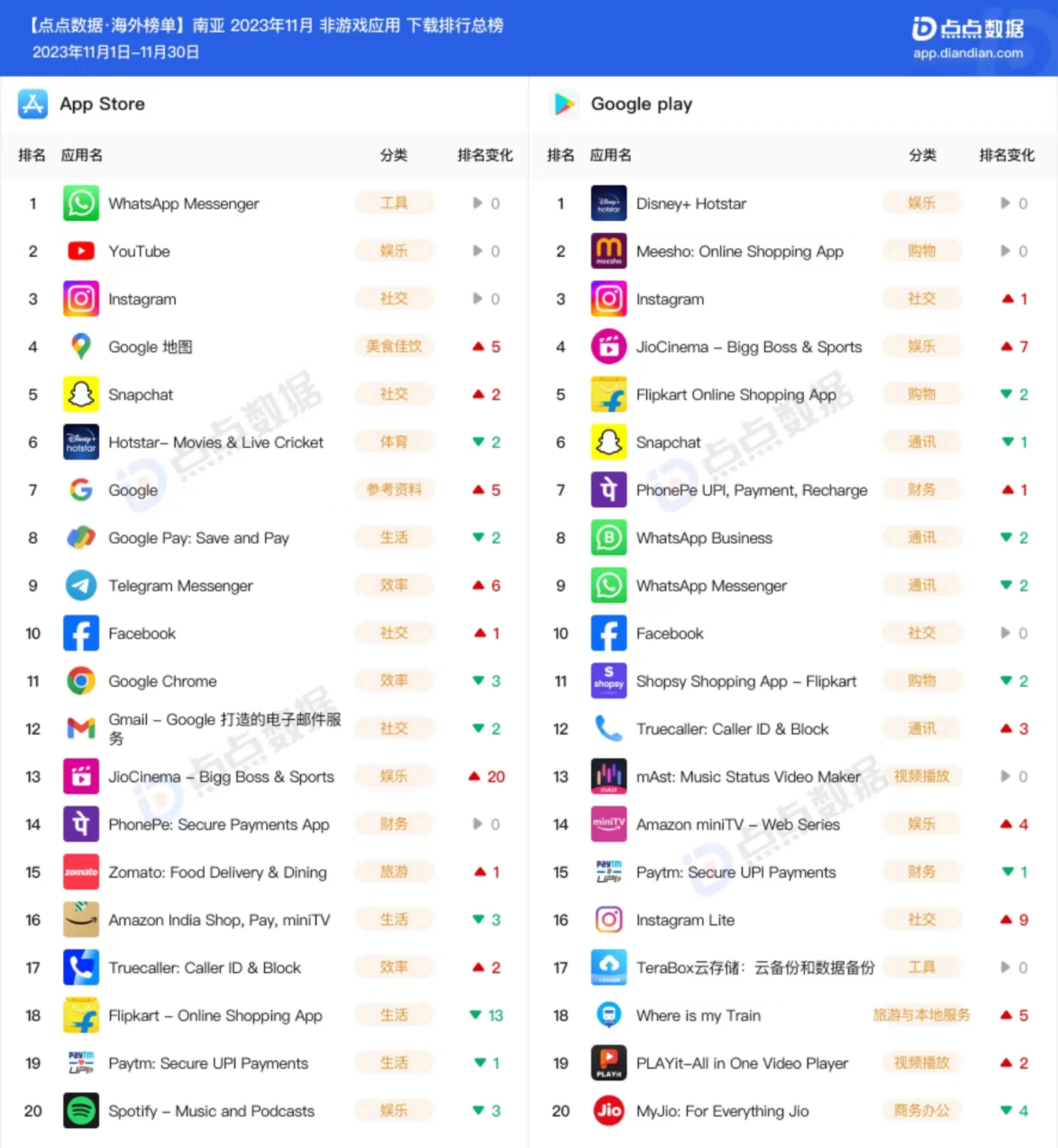 依托互联网移动应用大数据平台“点点数据”,点点出海基于南亚地区 App Store 和 Google Play 两大应用市场,分别整理下载榜和收入榜 Top20 应用&游戏,希望帮助从业者更好地了解海外最新的产品趋势和变化。