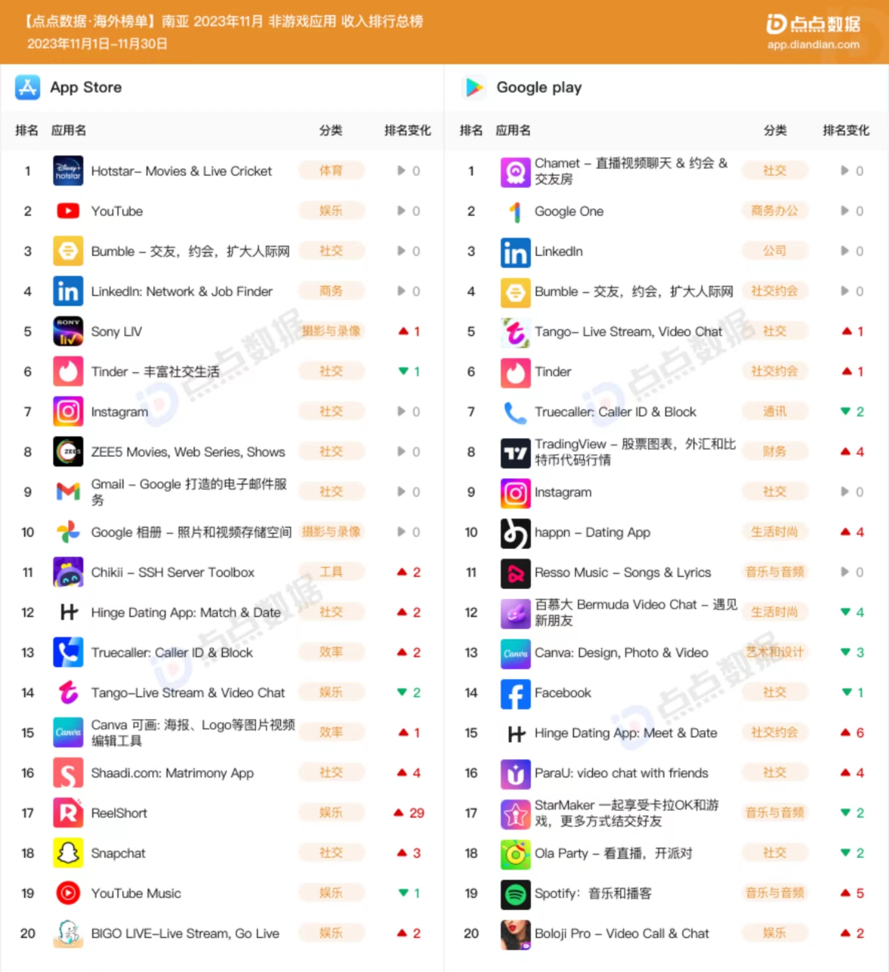 11 月南亚地区非游应用收入冠军再次由杭州富聊科技旗下 1v1 视频交友社交应用 Chamet 摘得,其上月单平台预估收入有所回落至 90 万美元。App Store 这边则依旧由坐拥大量会员用户的流媒体应用 Disney+ Hotstar 蝉联收入榜冠军。头部应用排名变化幅度相对较小。