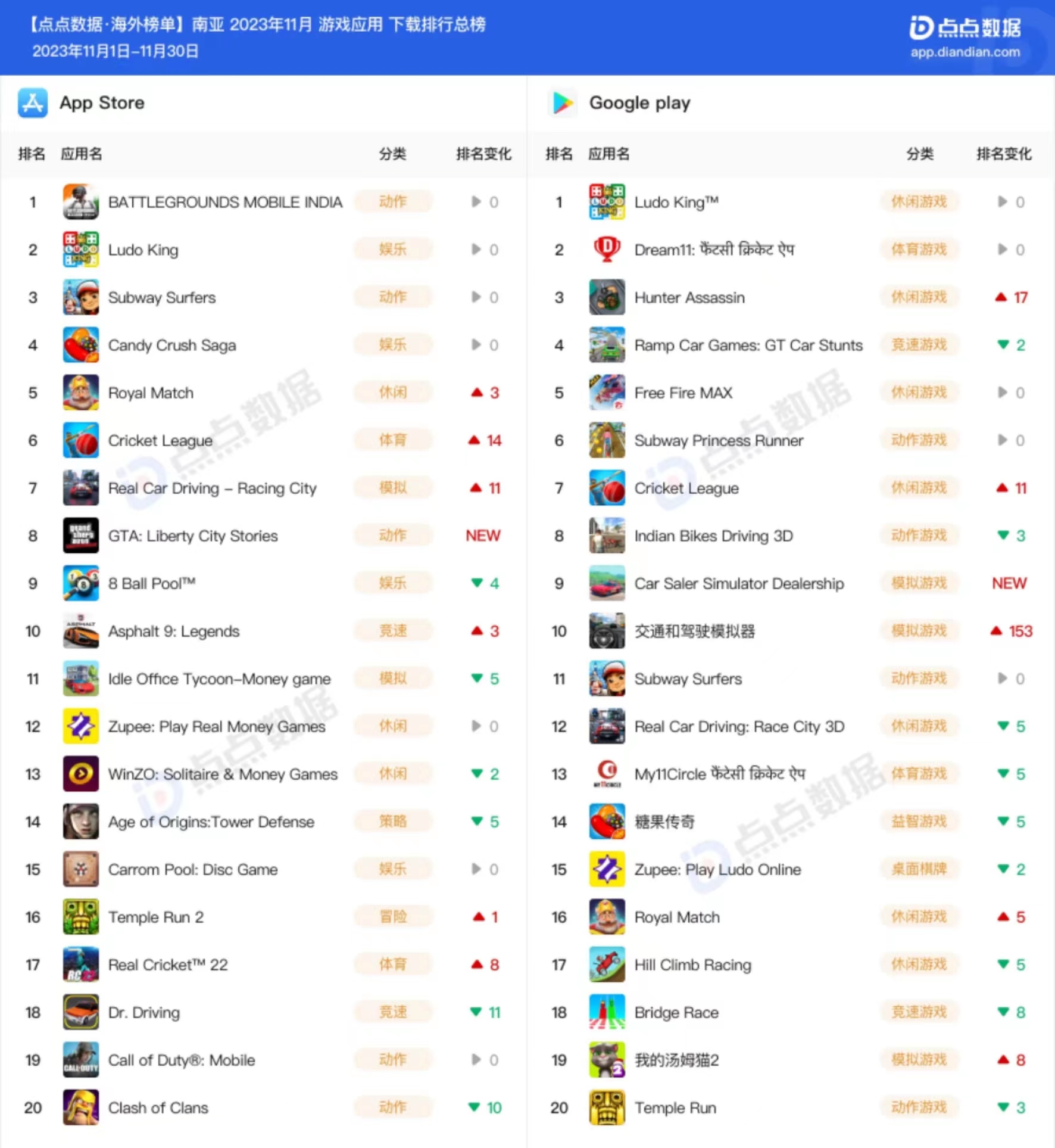 与此同时,11 月 R 星经典游戏《GTA: Liberty City Stories》也是重新上架 App Store 平台,免费的游戏也是吸引了一众端游老玩家的下载安装。此外,上月排名上浮明显的还有来自土耳其 Ruby Game 的《Hunter Assassin》以及板球联盟模拟游戏《Cricket League》。